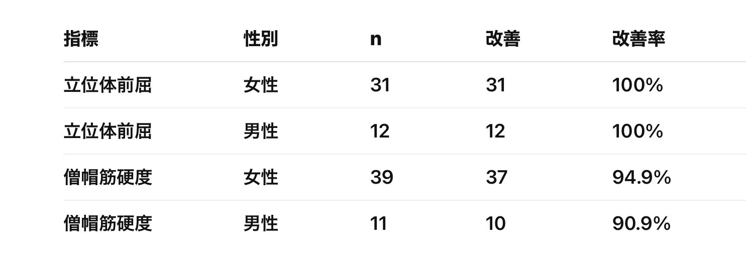 養生サポートバンド装着データ採取の結果です。僧帽筋硬度がn=50、立位体前屈がn=43になりました。立位体前屈は100%の屈曲増加、僧帽筋硬度は90%以上の方で硬度が減少する変化があります。生のデータは下記の通りでした。引き続き各地を回っていきます。2025/08/03 奈良県ワークショップ データ<立位体前屈>女性 30代 8cm→10cm女性 50代 10cm→15cm男性 50代 1cm→7cm男性 40代 2cm→9cm女性 50代 2cm→7cm男性 40代 15cm→16cm 左逆巻 17cm女性 50代 14cm→19cm<僧帽筋硬度>10代 女性 36→29男性 50代 52→48女性 50代 45→43女性 50代 46→32女性 50代 43→35男性 40代 46→38男性 40代 45→38女性 30代 45→33<2025/08/26札幌ワークショップ><立位体前屈>現行品を使用してのデータです。その人に合わせた装着方向を探ってからのデータです。女性 8cm→11cm男性 14cm→16cm女性 12cm→13cm女性 5cm→10cm女性 −1cm→1cm男性 −30cm以上→−21cm女性 −2cm→±0<僧帽筋硬度>腕用サンプル品を使用してのデータです。全員外巻きです。女性 39→18男性 43→34女性 20→33 女性 47→24女性 29→40男性 29→34女性 22→16立位体前屈は全員深まり、僧帽筋硬度は3名以外低下しました。仮説ですが、筋肉の硬度が最初から低いタイプは適切な硬さにアジャストされているかもしれません。要検証ですね。[2025/08/16 Studio Libraにてデータ採取しました。]<僧帽筋硬度>腕用サンプル品を使用してのデータです。全員外巻きです。50代女性 40→3560代女性 47→3440代女性 53→4650代女性 47→4150代女性 右31→40 左37→2050代女性 右40→40 左42→3760代女性 右44→43 左48→45[2025/09/27金沢ワークショップ]参加者2名だったのですが、1名来られず。そのかたは大阪へ振替になりました。<立位体前屈>現行品を使用してのデータです。その人に合わせた装着方向を探ってからのデータです。女性 9cm→12cm <僧帽筋硬度>腕用サンプル品を使用してのデータです。全員外巻きです。女性 57→50 [高知ワークショップ 2025/10/19]参加者3名、うち1名は奈良県でデータ採取に参加していたためのぞいています。<立位体前屈>現行品を使用してのデータです。その人に合わせた装着方向を探ってからのデータです。女性 13cm→15cm(順方向) 男性 0→4.5(左右ともに逆巻き)→ 7(右順方向、左逆巻き) <僧帽筋硬度>腕用サンプル品を使用してのデータです。全員外巻きです。女性 43 →30男性 43 →322025/10/25 新潟ワークショップ 4名参加予定で1名来られず。<立位体前屈>現行品を使用してのデータです。その人に合わせた装着方向を探ってからのデータです。今回全員順方向巻きです。女性 5cm →8.5cm女性 8cm→13cm女性 3cm→7cm<僧帽筋硬度>腕用サンプル品を使用してのデータです。全員外巻きです。女性 25→27→22→18 (付記。本日寝違えていて、腕用をつけたらすぐ楽になった。)女性 32→ 24女性 28→21これで立位体前屈は通算20名のデータを取ることができたのですが、全員改善できています。僧帽筋硬度は27名採取、うち3名だけ硬度が上昇。それ以外は硬度が下がりました。ちゃんと物理的に作用しています!2025/11/23名古屋ワークショップ<立位体前屈>現行品を使用してのデータです。その人に合わせた装着方向を探ってからのデータです。女性 −12cm→順方向−10cm 左だけ逆−8cm 左右逆−7cm男性 ±0→順方向+1cm 左だけ逆 +3cm 左逆+左リスフラン関節に順方向+5cm 女性 −2cm→順方向−1cm 右のみリスフラン関節順方向±0女性 +5cm 順方向 +8cm女性 −2cm 順方向 −1cm 右だけ逆 -1cm 左右逆±0女性 +4cm 順方向 順方向+6cm男性 ±0 順方向+1cm 両足逆+1.5cm女性 ±0 順方向+2 両足逆+1 <僧帽筋硬度>腕用サンプル品を使用してのデータです。全員外巻きです。女性 26→38 2回目測って36女性 29→27女性 30→25女性 27→25女性 44→36男性 30→28男性 43→41女性 35→24前屈は全員改善されています。僧帽筋硬度ですが、何もつけずに20台の数値の人は巻くと上がる傾向が確認されつつあります。2026/01/24大阪ワークショップ<立位体前屈>現行品を使用してのデータです。その人に合わせた装着方向を探ってからのデータです。女性 5cm→11cm 順方向女性 1cm→3cm 順方向女性 -12cm→5cm(甲が高いので靴で擦れるとのこと)順方向女性 -5cm→順方向で変わらず→逆+3cm女性 3cm→順方向5cm→左だけ逆5cm男性 10cm→右順左逆13cm<僧帽筋硬度>腕用正規品を使用してのデータです。全員外巻きです。女性 42→37女性 45→40男性 35→30女性 35→20女性 47→27女性 33→30福岡県 2026年3月22日 <立位体前屈>女性 マイナス4cm 順方向巻き ±ゼロ 逆方向巻き +1cm リスフラン関節順方向巻き +3cm男性 マイナス6cm 順方向巻き マイナス4cm 逆方向巻きマイナス7cm リスフラン関節順方向巻き マイナス3cm<僧帽筋硬度>女性 装着前42 装着後 35男性 装着前30 装着後 27大阪 2026年3月29日<立位体前屈>女性 +17 順方向巻き 測定装置上からでも床についてしまった女性 +4.5 順方向巻き +13cm女性 +5cm 順方向巻き +10.5cm女性 +6cm 順方向巻き +11cm男性 +13cm 順方向巻き +16cm男性 マイナス5cm 順方向巻き マイナス3 左リスフラン関節順方向巻き マイナス5左逆方向巻き マイナス3(楽に曲ったのは