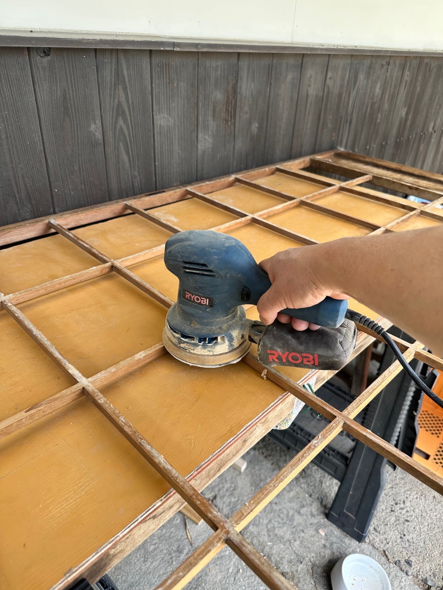 障子紙を剥がしたところ、のりの跡がいっぱいあり、障子はがしの液剤を使ってもなかなか取れないので、サンダーを使うことにしました。障子自体も年数が経っており、毛羽立っていたので一石二鳥となりそうです。