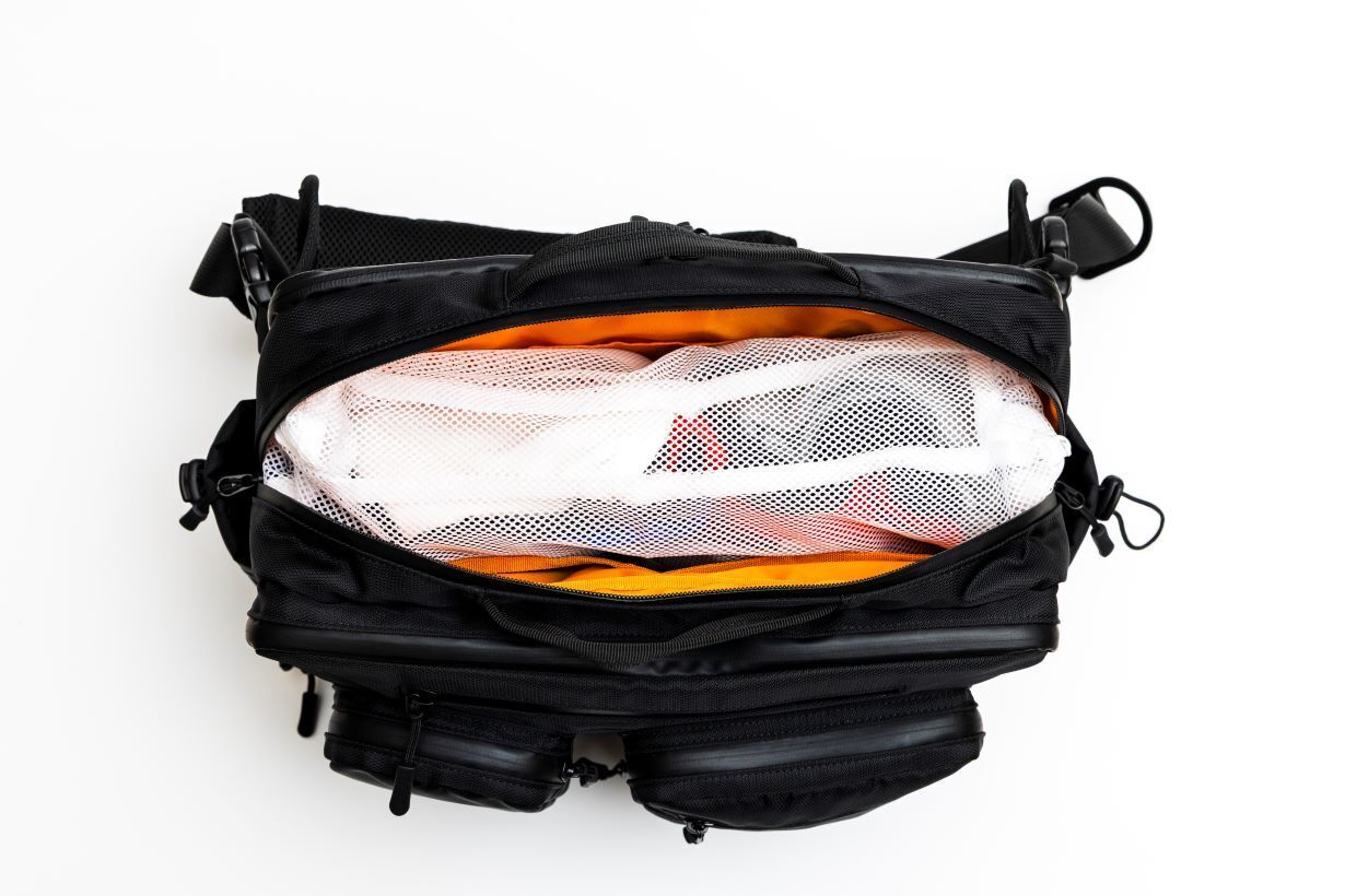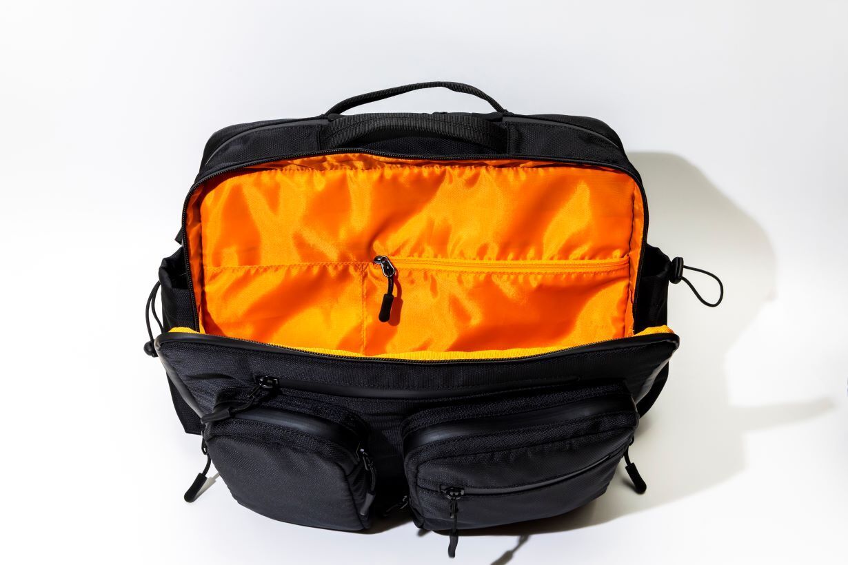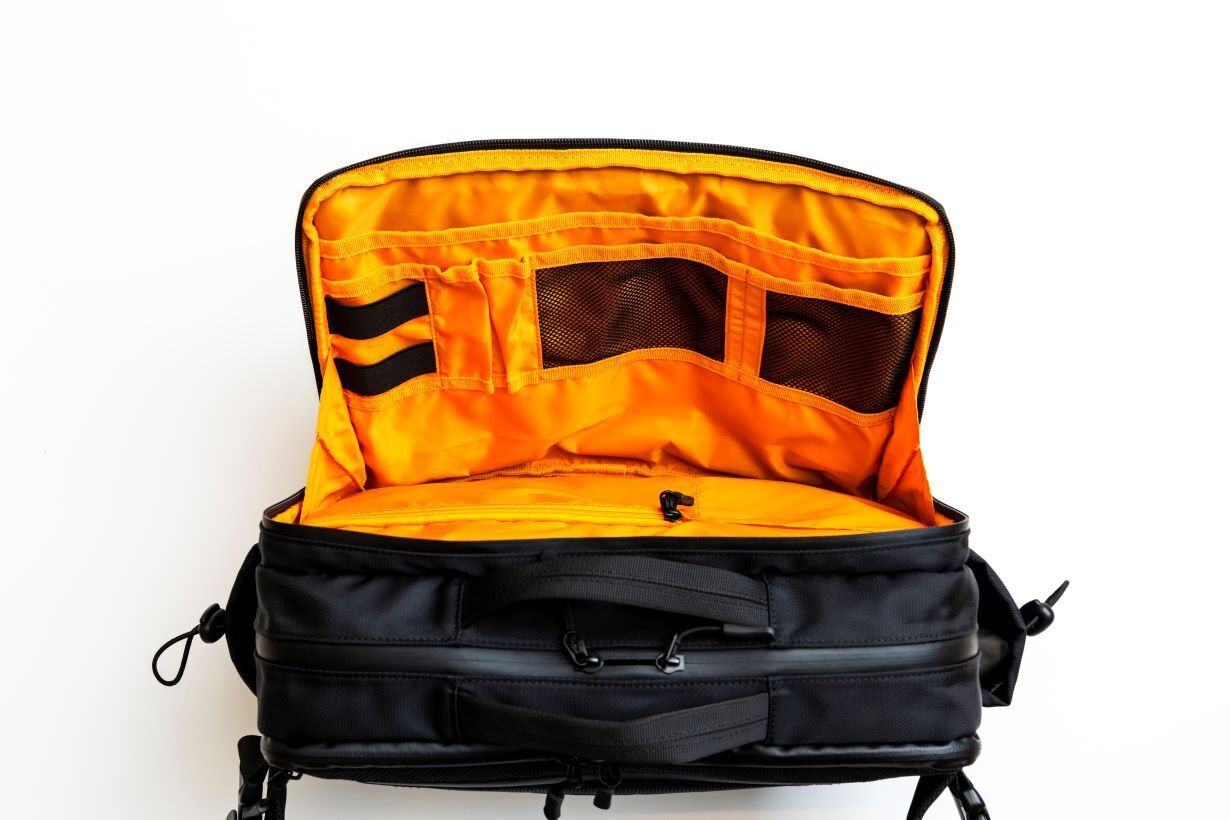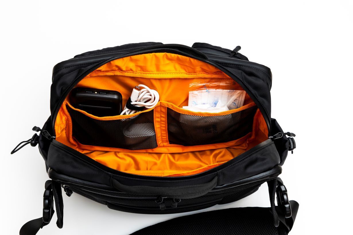 フロント部分の1stエリアには4つのZIPポケットがあり全て止水ファスナーを採用しております。スマホや鍵などすぐに取り出したいものを収納するのに便利です。