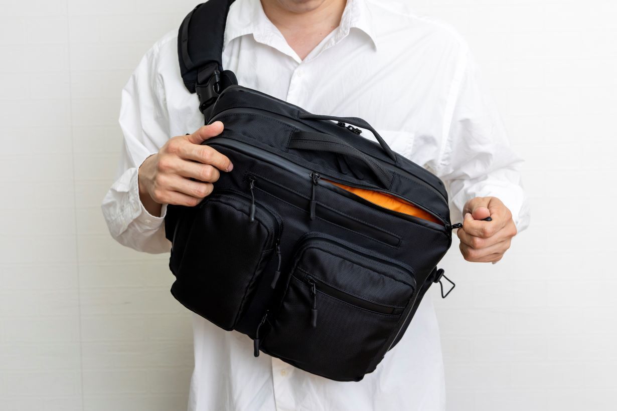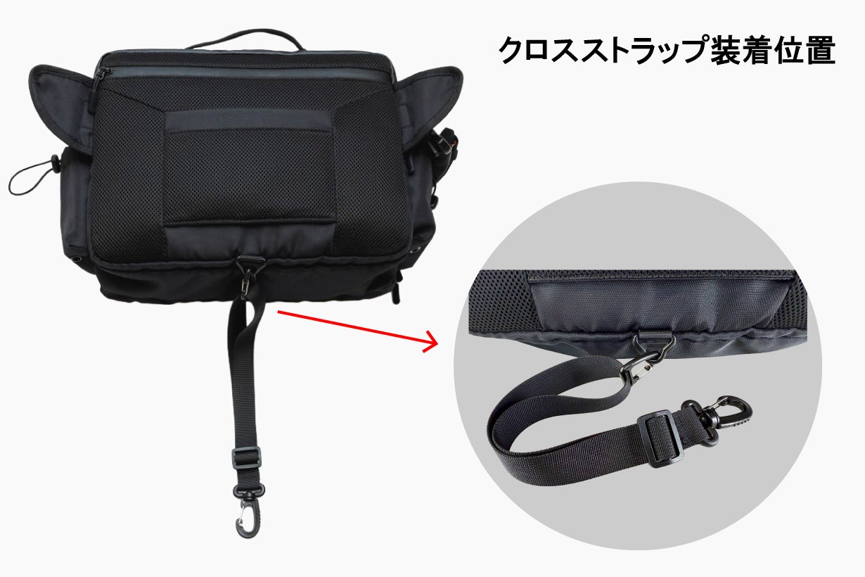 クロスストラップでバッグを体に安定させる事で片方の肩の負担が軽減されます。