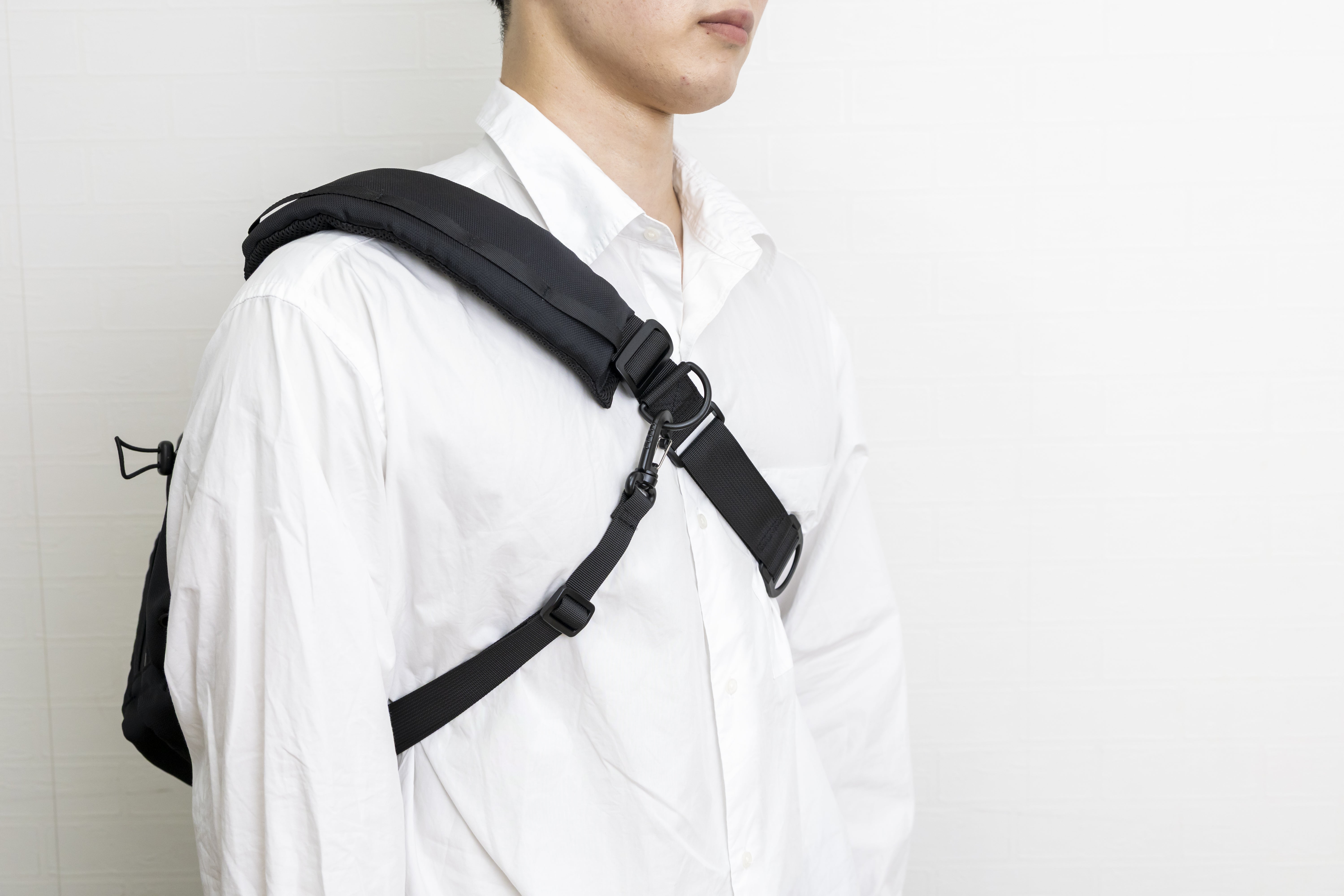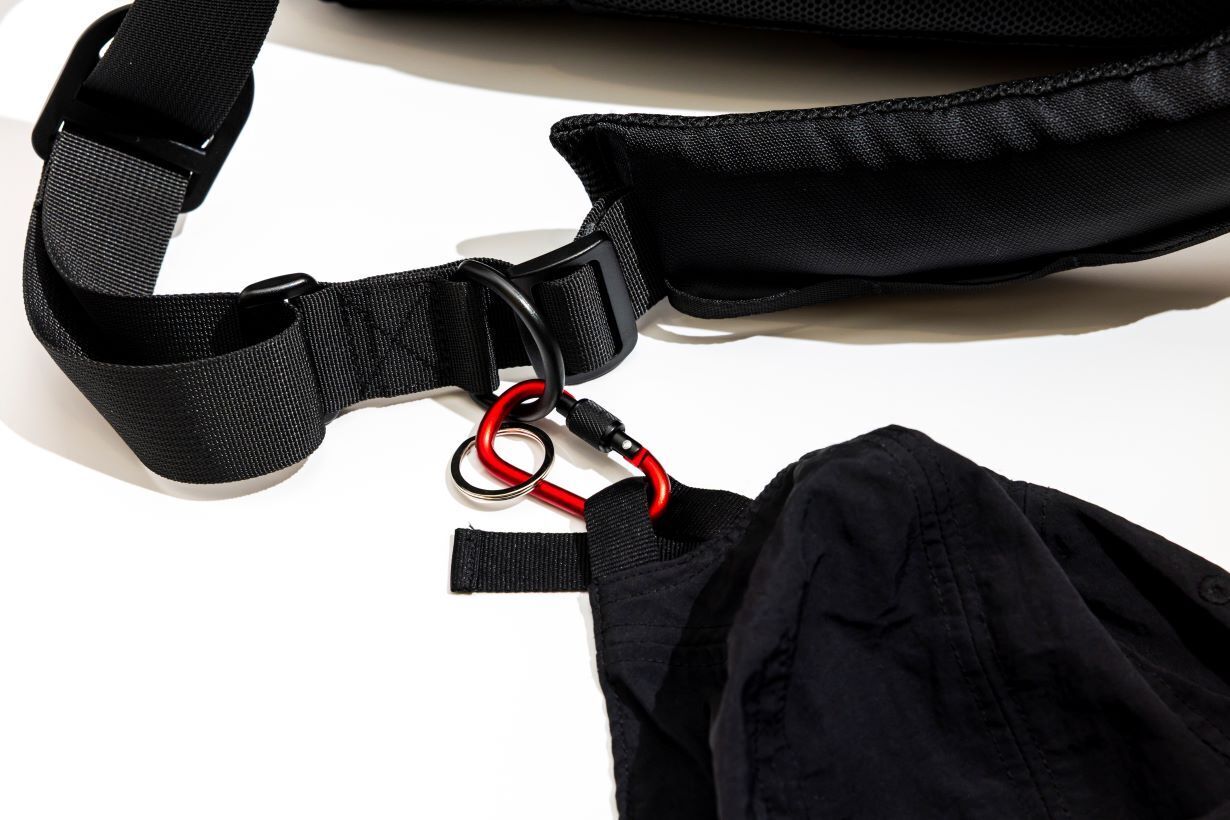 ショルダーベルトにはスライド調整バックルとは別にもうひとつDカンを付けています。クロスストラップを掛けるだけではなく、お好みに合わせてカラビナを掛けたり、帽子を掛けたりもできます。