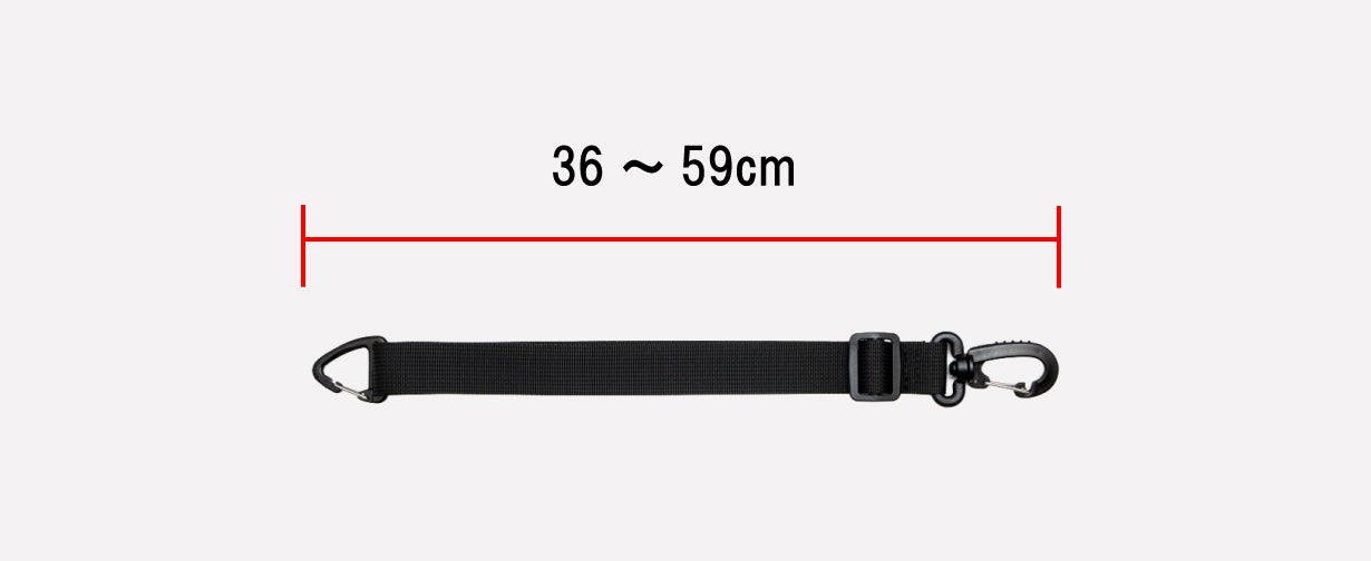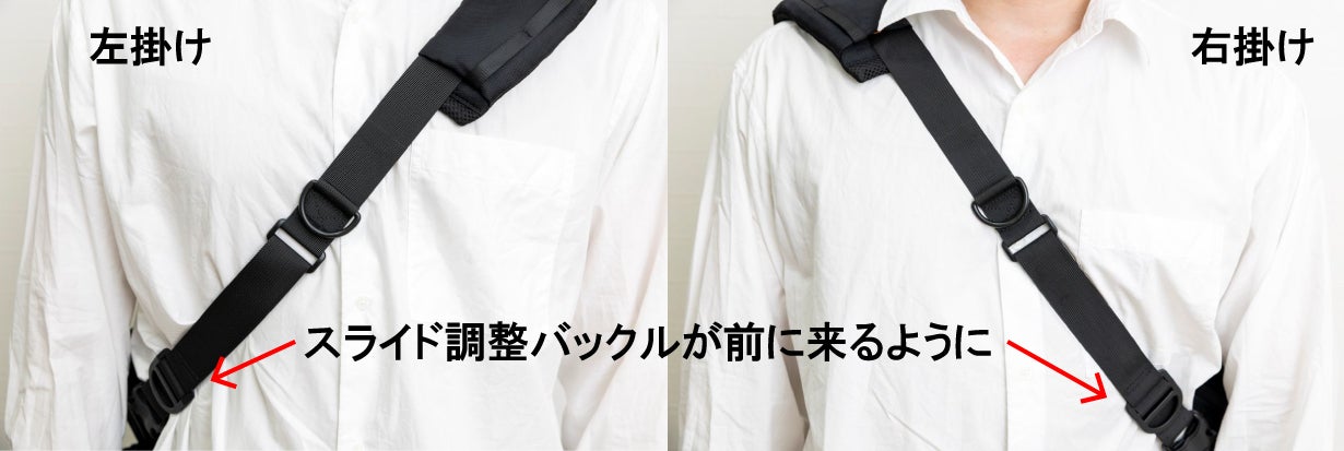 ※通常は左肩にバッグを掛けた時に、スライド調整バックルを下に引っ張ると 長さ調整ができます。右肩使用時はまず、バックルが前に来るようにショルダーベルトを 付け替えてください。
