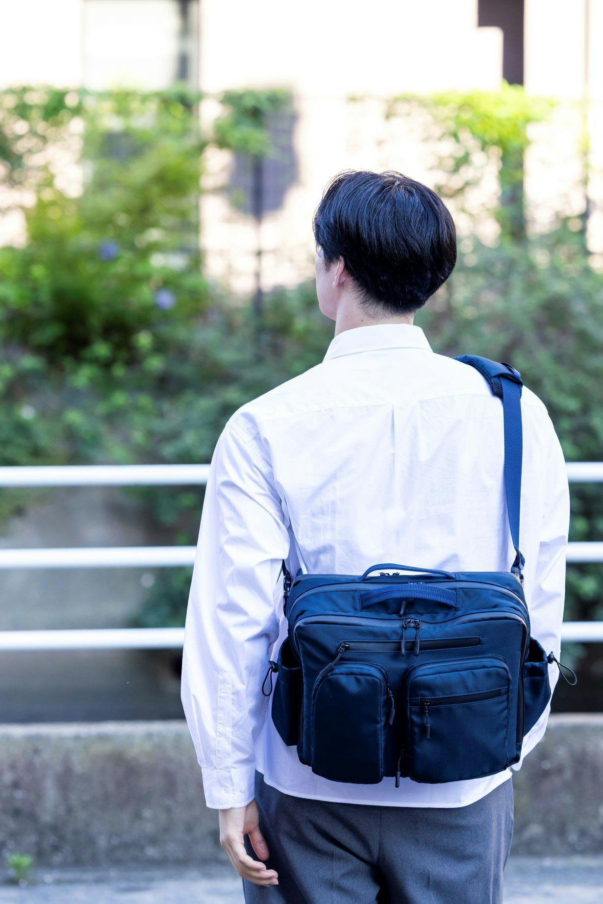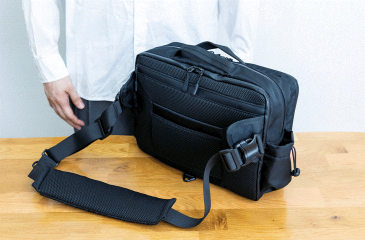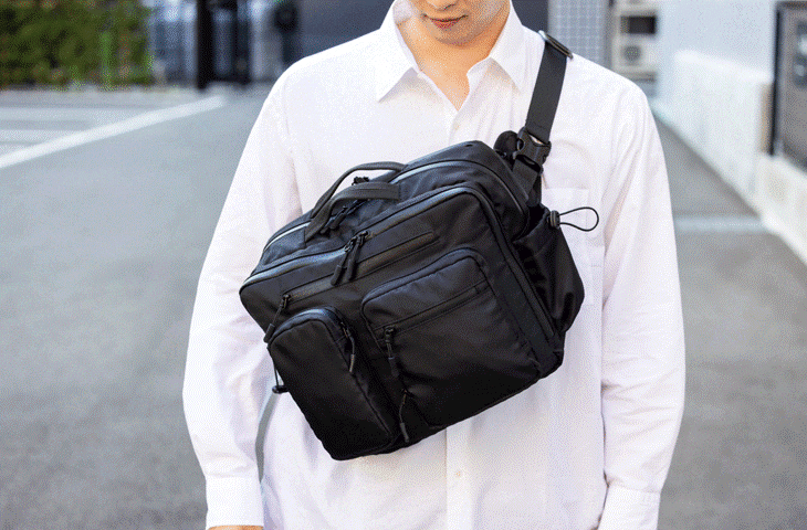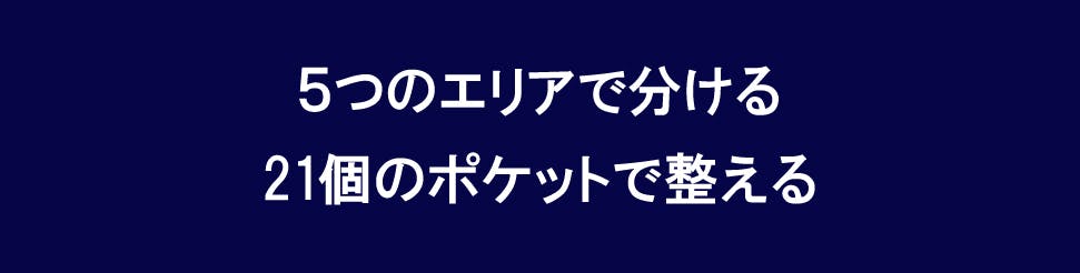 今回のバッグは収納、整理力とプラスαの機能性にいちばんこだわりました。 5つのエリアと21個のポケットで驚きの収納力。細かなアイテムもスッキリ 整理できる大容量バッグです。3WAY仕様でショルダーバッグ、ボディバッグ、 手提げとシーンに合わせて持ち方を自由にチェンジ。通勤、通学、旅行、デイリーまでこれひとつでスマートに対応します。 肩の負担を軽減するショルダーパッド、クロスストラップなど便利な機能も標準装備しております。