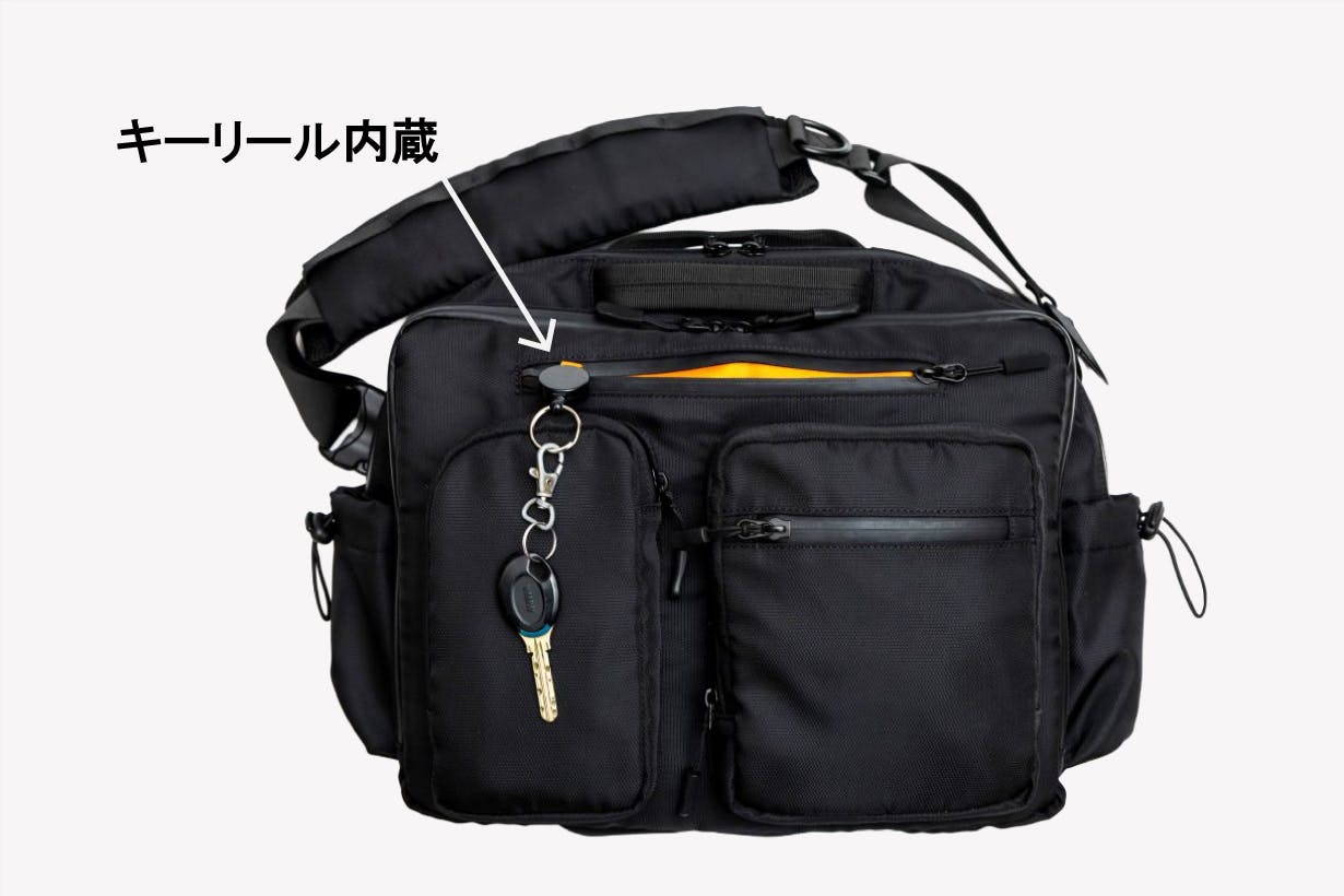 バッグ上部にはサッと取り出しやすい横長ZIPポケットがあります。ポケットに内蔵されたキーリールに鍵をつけておけば、もうバッグの中をゴソゴソ探す必要はありません!いちばん使いやすい場所にあり、手がふさがっている時にも大活躍です。