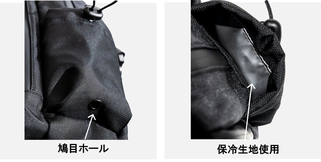 バッグの両サイドにはペットボトルや折りたたみ傘が入るボトルホルダーがあります。ポケットには荷物を押さえる調整ゴムと水気を放出する鳩目ホールをつけました。裏側には保冷生地を付けています。