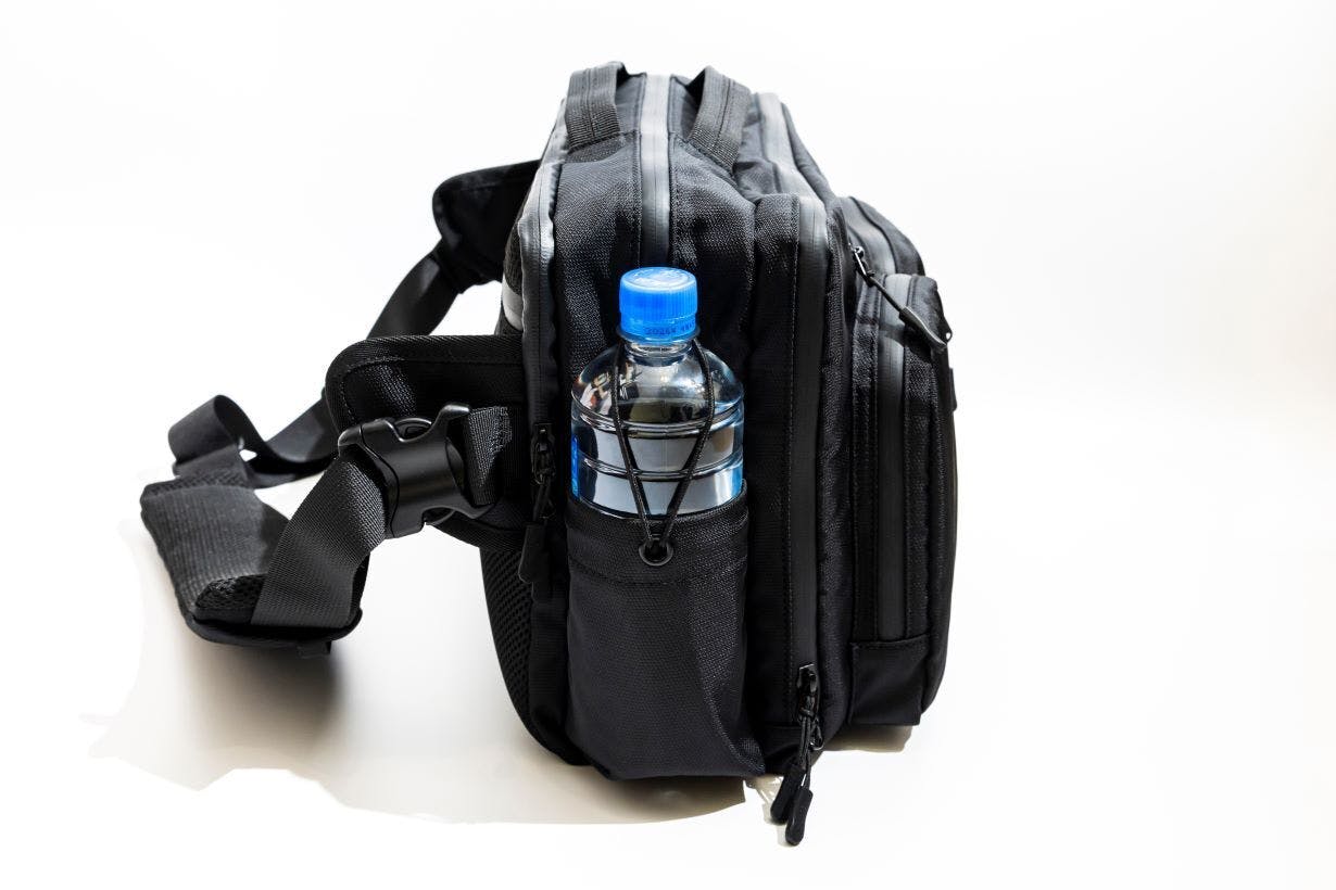 ペットボトルにゴム紐をかけるとバッグが斜めになってもボトルが安定します。