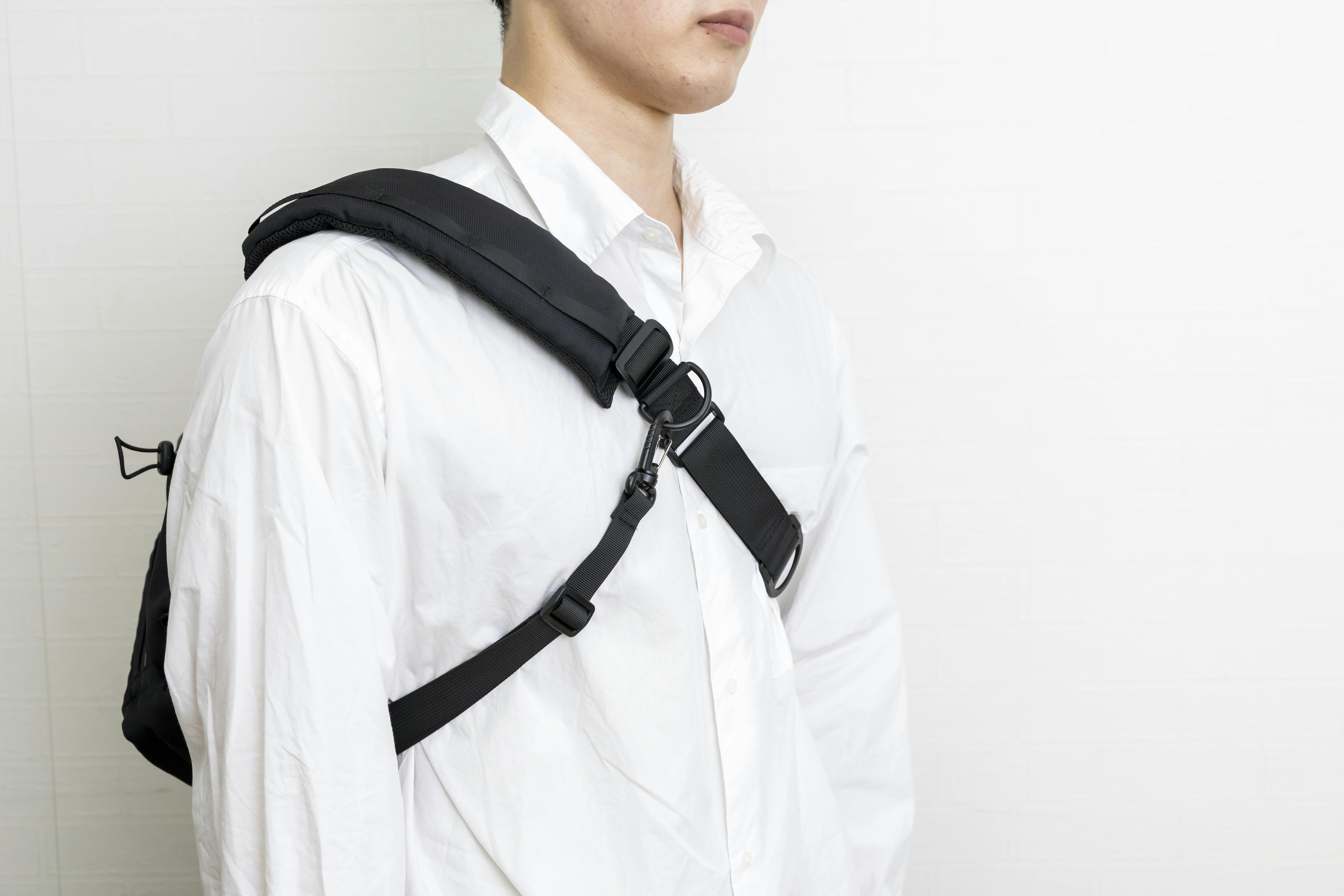 大容量バッグだと荷物をたくさん入れてしまって肩が痛くなる! そんなお悩みを解消する為にショルダーベルトにショルダーパッドを取り付けました。 クッション性もあり肩の負担を軽減し、着脱可能ですので用途に応じてご使用いただけます。