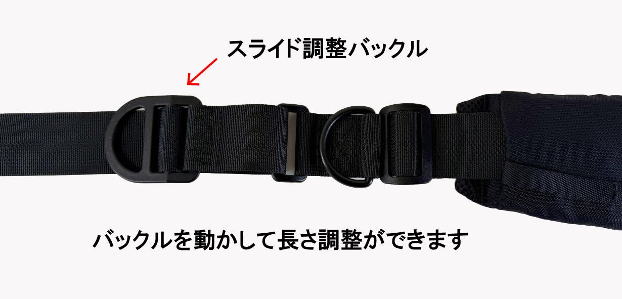 ベルトのスライド調整バックルを引っ張って簡単に長さの調整が出来ます。