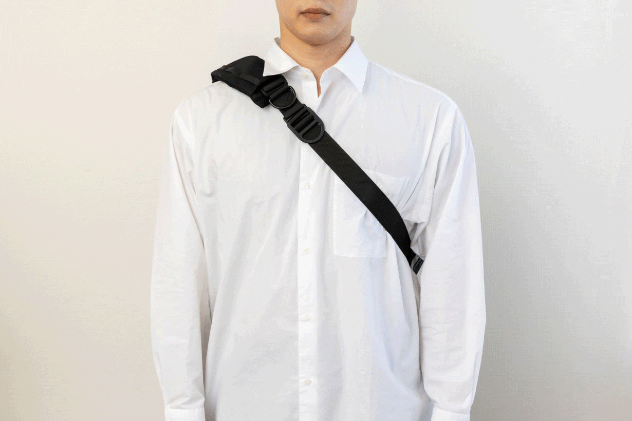 ショルダーベルトにはスライド調整バックルとは別にもうひとつDカンを付けています。クロスストラップを掛けるだけではなく、お好みに合わせてカラビナを掛けたり、帽子を掛けたりもできます。