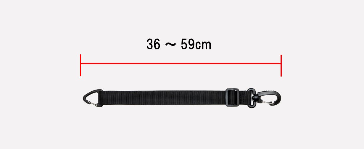 ※通常は左肩にバッグを掛けた時に、スライド調整バックルを下に引っ張ると 長さ調整ができます。右肩使用時はまず、バックルが前に来るようにショルダーベルトを 付け替えてください。