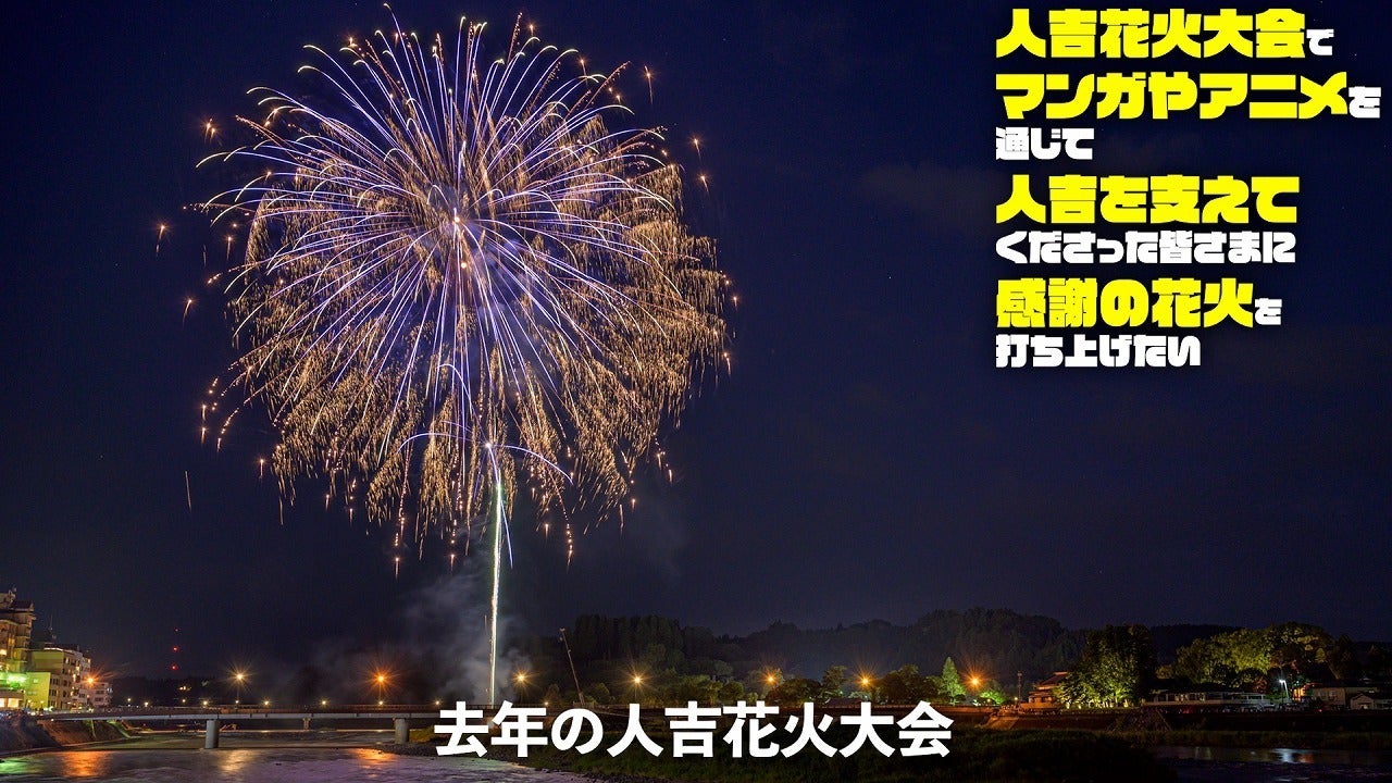 令和2年7月豪雨災害後の人吉の復興を力強く後押ししてくださったのが、人吉をゆかりの地にしたマンガやアニメと、全国からゆかりの地を訪れてくれるファンの皆さまでした。まだ復興半ばの人吉ですが、マンガやアニメを使って人吉の復興を支援してくださった作者や関係者の皆さまに恩返しがしたいとの思いでいっぱいです。 そこで「人吉だからこそできる恩返し」 の方法を模索し、全国的に注目される人吉花火大会で感謝の花火を打ち上げるプロジェクトを立ち上げました。