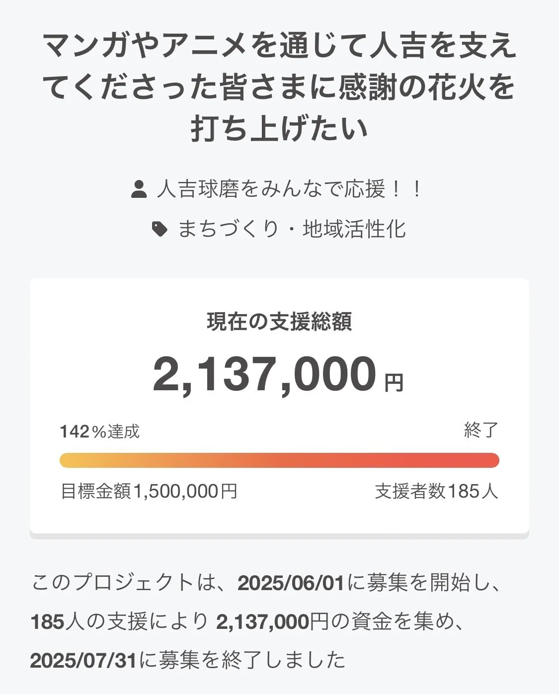 このプロジェクトは、2025/06/01に募集を開始し、 185人の支援により 2,137,000円の資金を集め、 2025/07/31に募集を終了しました