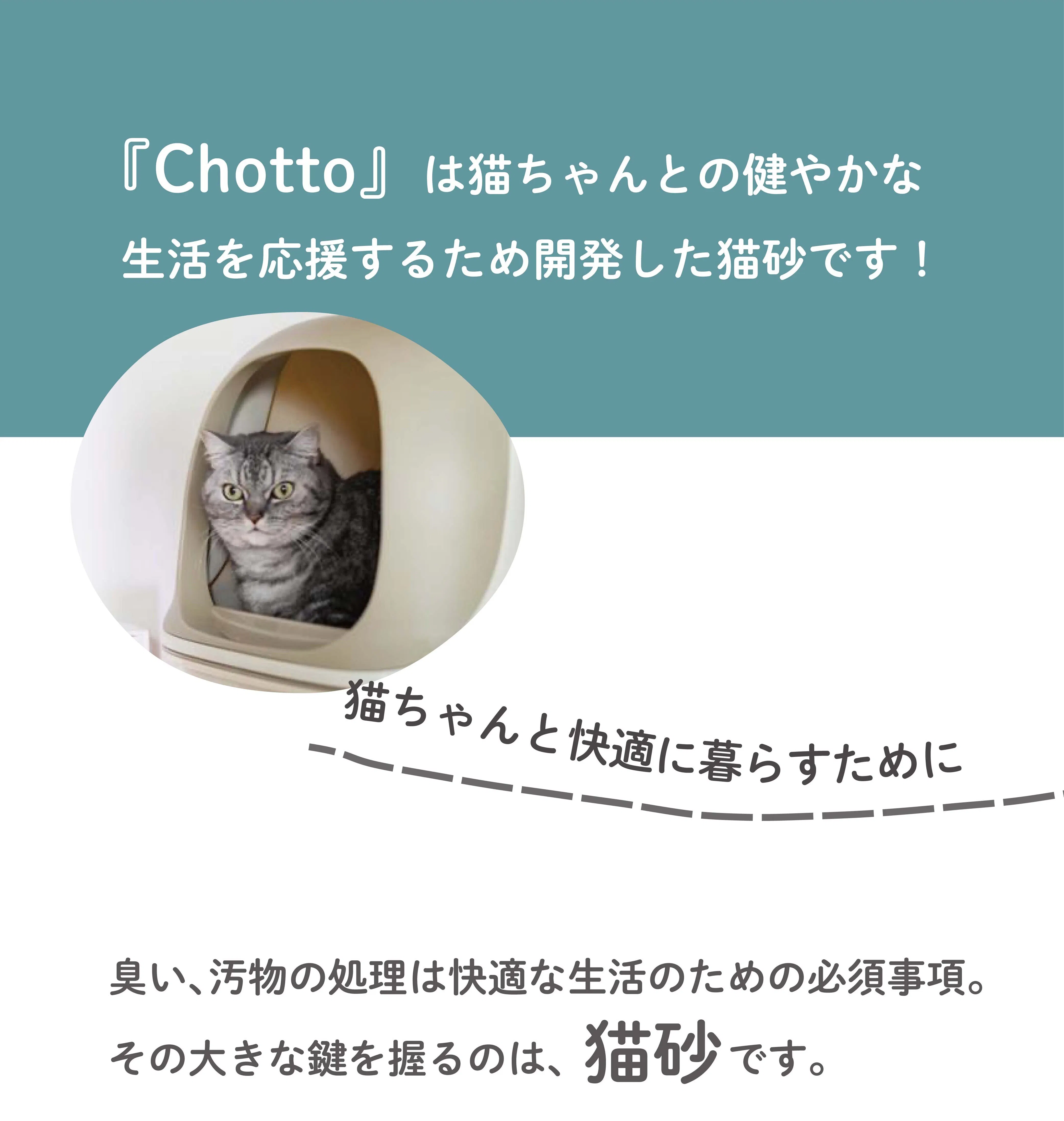 猫砂「Chotto」は、植物由来の原材料を使用し、自然の力を活かして少ない量でも高い吸水性と凝固性を実現しました。「ちょっと」の量で、猫にも飼い主にも、そして地球にも「ちょっと嬉しい」を届けたいという思いを込めています。