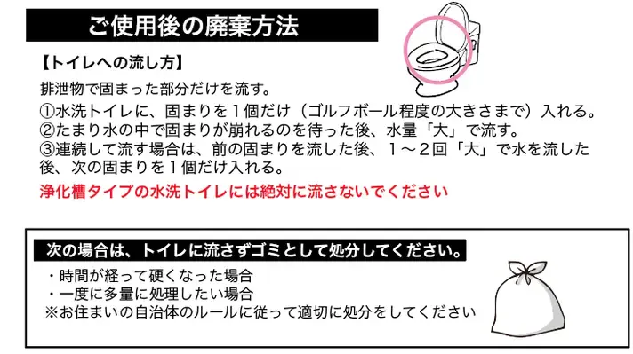 A.水溶性なのでトイレに流すことができます。一度にたくさん流すと詰まる危険があるので、取扱注意を確認の上、少量ずつ流すようにしてください。