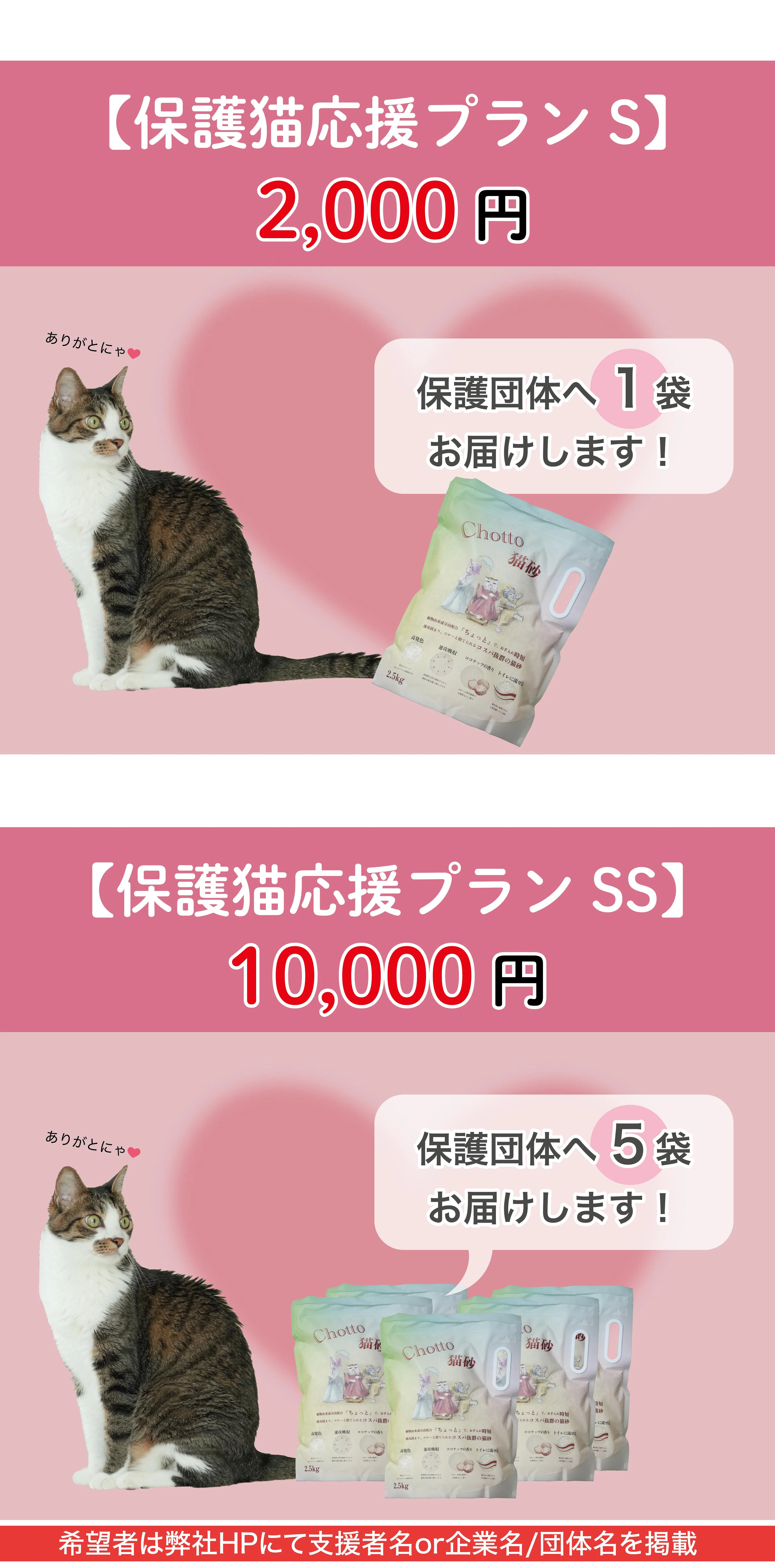 本プロジェクトでは、支援金額に応じて猫砂「Chotto」を、保護猫団体へ寄付いたします。この取り組みは、製品の販売を通じて、保護猫活動を応援したいという思いから始まりました。