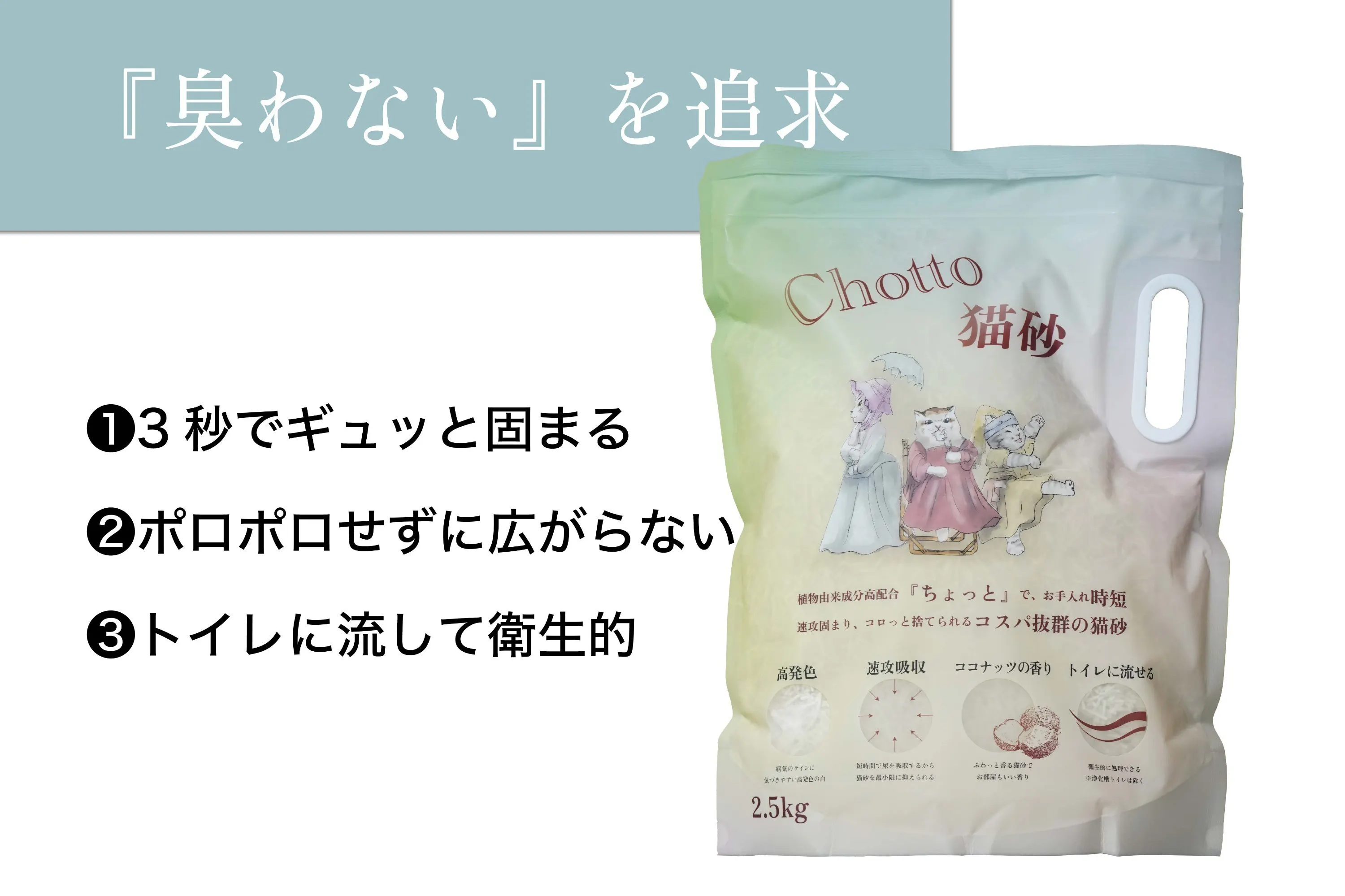 「Chotto」は、凝固速度の向上とアンモニア臭の揮発抑制、崩壊耐性のバランスを最適化するために、