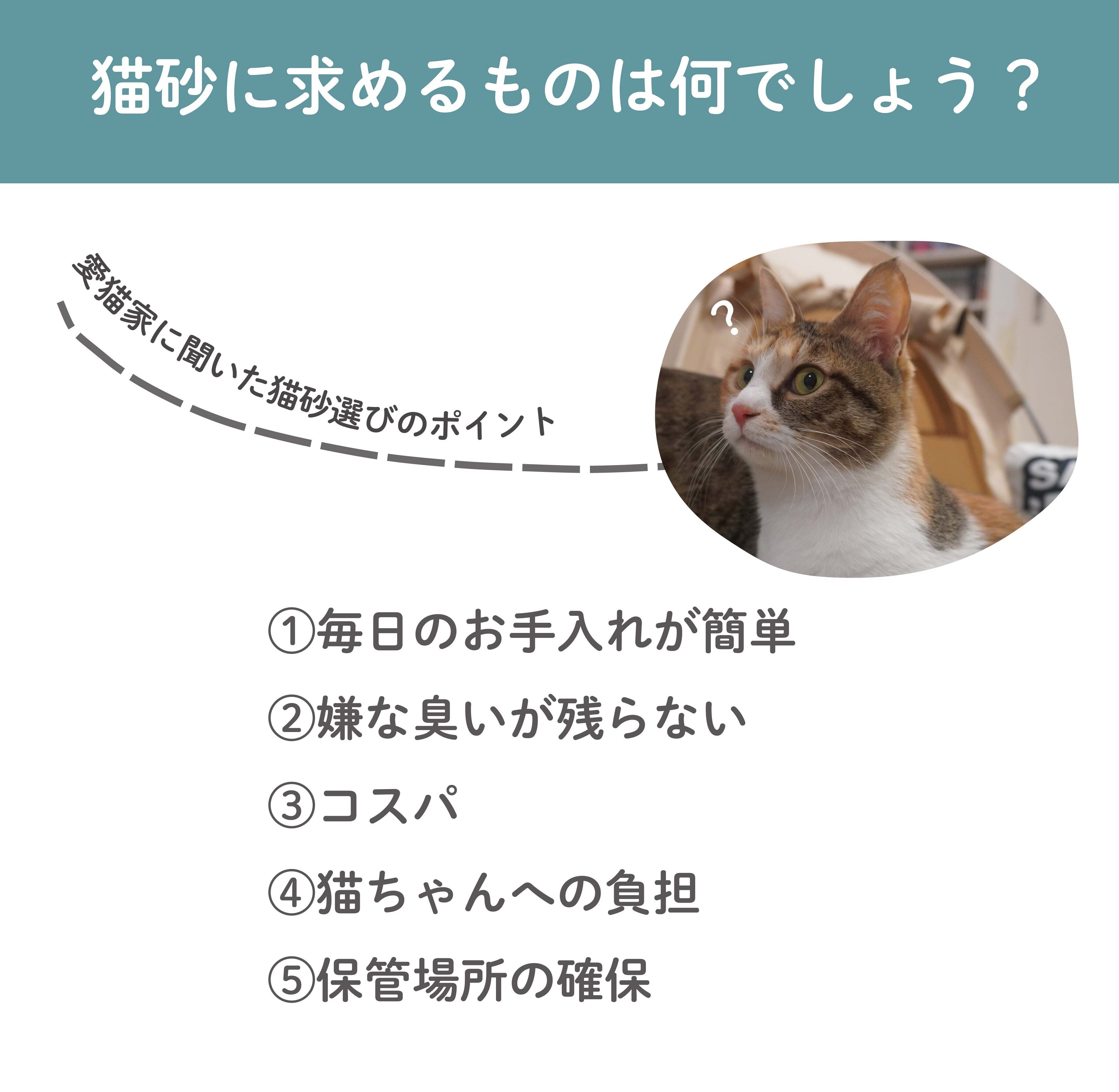 愛猫家のアンケート結果によると、この5つが猫砂選びの重要ポイントとのことです。