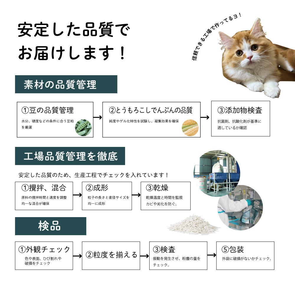 さらには――使用する豆の種類、成分比率、そして製造方法によって、猫砂としての品質は大きく異なります。