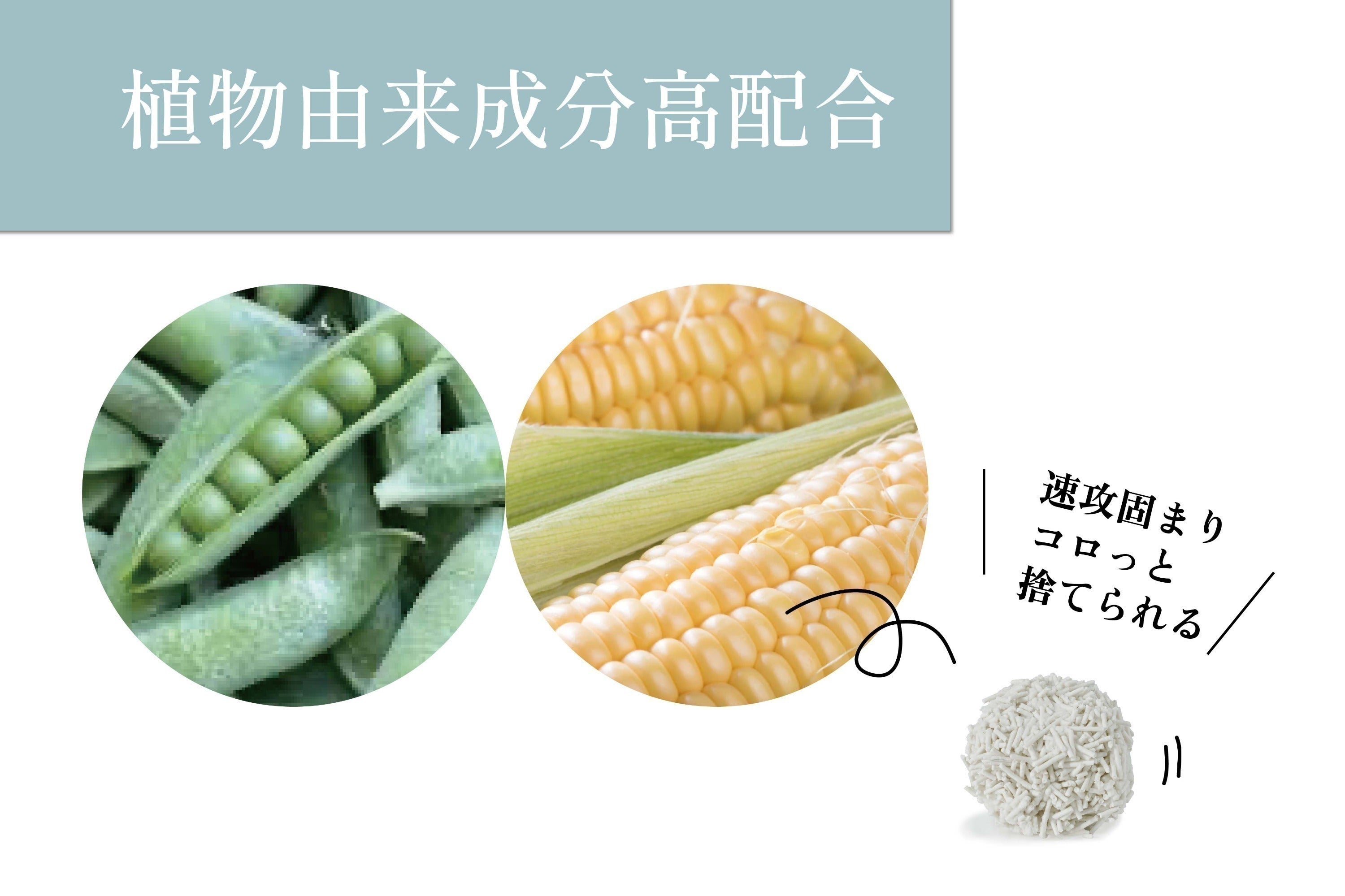 これは、尿に含まれる尿素が細菌によって分解されることで発生するアンモニアの臭いです。とうもろこしや豆など植物由来の素材は、多孔質で水分を素早く吸収する性質。