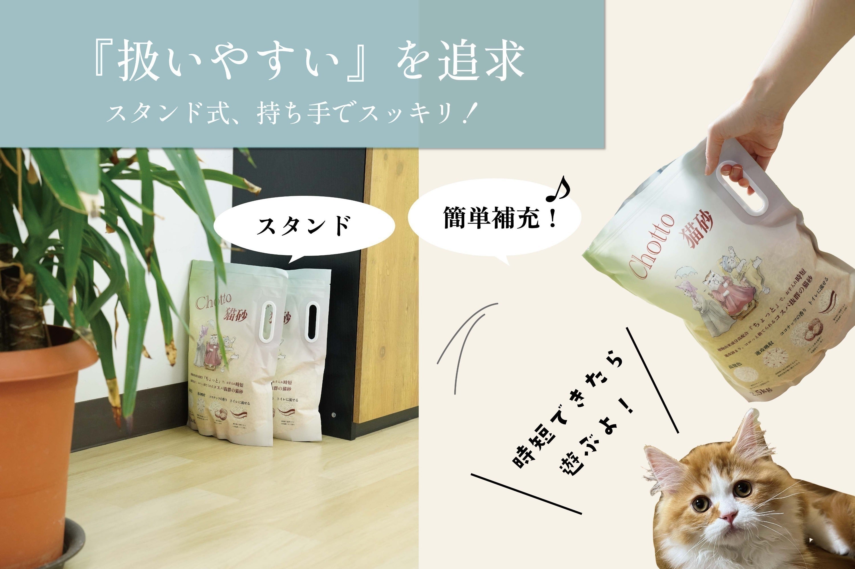 猫砂「Chotto」は、植物由来の原材料を使用し、自然の力を活かして少ない量でも高い吸水性と凝固性を実現しました。「ちょっと」の量で、猫にも飼い主にも、そして地球にも「ちょっと嬉しい」を届けたいという思いを込めています。