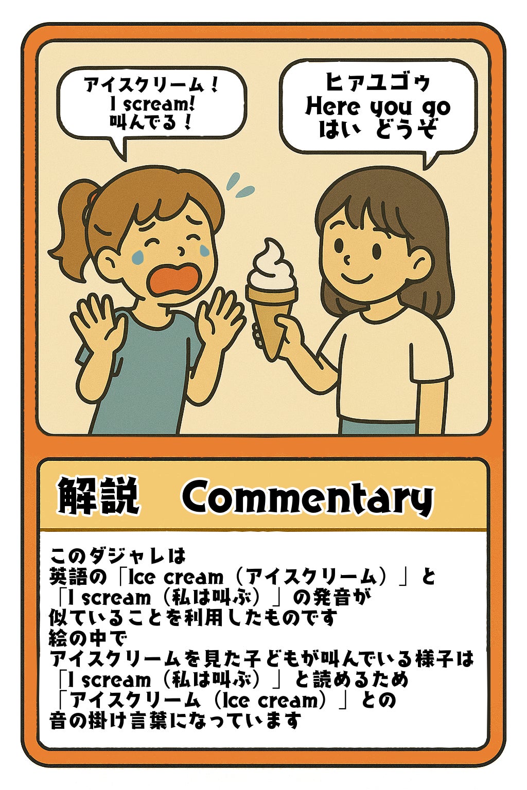 今回のネタ画像「Ice cream」と「I scream(叫ぶ)」の音のダジャレを、