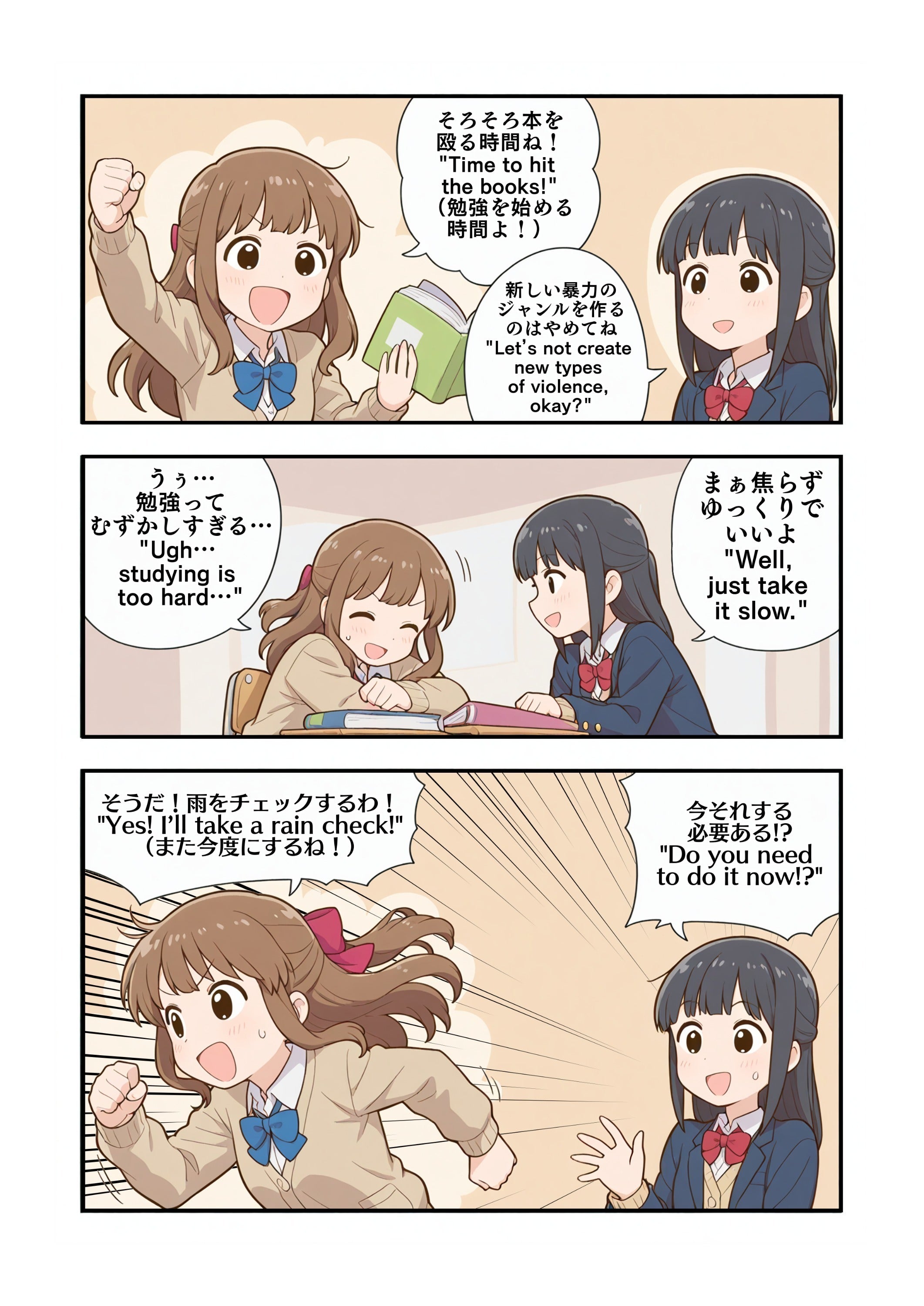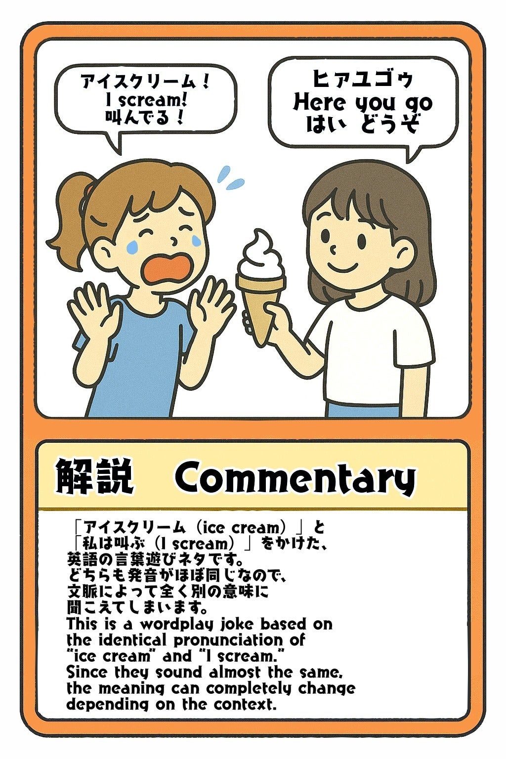 2025/05/18 20:55英語学習ワールドの方向性を探るため、現在はネタ画像の制作を中心に進めています。とりあえずAIを使って仮制作してみたのがこちら↓今回のネタ画像「Ice cream」と「I scream(叫ぶ)」の音のダジャレを、1コマで表現したカード風のイラストです。このように、1コマで成立しそうなものは「カード形式」にしてみようかな?と考えています。カードのデザインはまだ仮ですが、今後もう少し整えていく予定です。こちらは「ため息をつくサイ(sigh+サイ)」という、日本語と英語の音をかけたダジャレネタです。●制作スタイルの検討中・1コマイラスト → カード風にまとめる・4コマなどの漫画形式も導入検討中※ネタ画像は最終的に30枚ほどを目指しています。●その他にも並行して進めているもの:・カタカナ英語リスト:実際の英語とは異なる意味・発音のカタカナ語を整理しています・不規則変化動詞リスト:go-went-goneのような形の動詞をまとめています・前置詞リスト:in, on, atなど、よく使う前置詞と例文・使い分けを検討中です・対義語リスト:hot / cold のような基本の反対語を中心に収集しています・似ている英単語リスト:発音やスペルが似ていて間違えやすい単語のセットですこれらも、字幕スーパー形式では読みにくくなるので、なるべく挿絵やアイコンを使って、見やすく・親しみやすい形に整えていきたいと考えています。●ご支援いただいた皆様、本当にありがとうございます。いろいろ並行して作業しているため進行はゆっくりですが、今後も丁寧に進めていきます! もっと見る