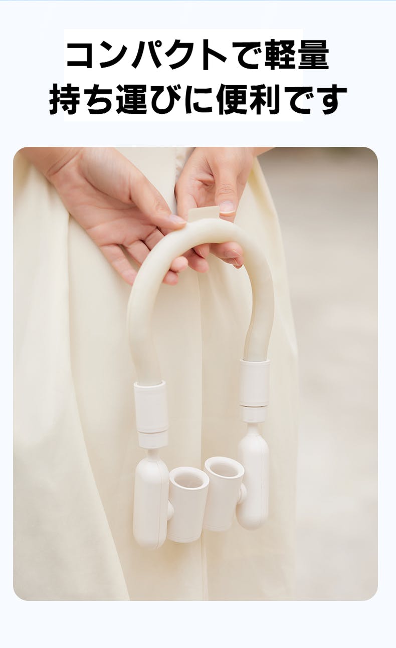 わずか数百グラムの軽量設計で、長時間使用しても首への負担が少ない設計。さらにコンパクトサイズのため、バッグに収納して持ち運びも簡単です。
