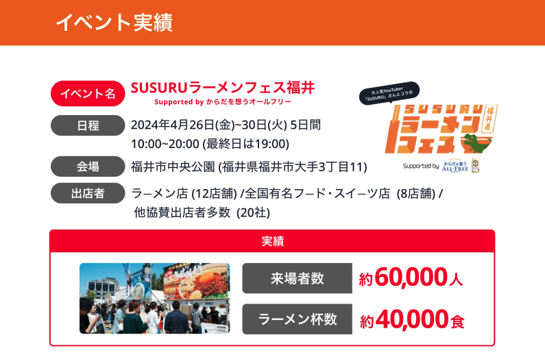 福井から届けるをモットーに毎年違う「食」「音楽」「地域」をテーマに絶品グルメが楽しめるフードブース。