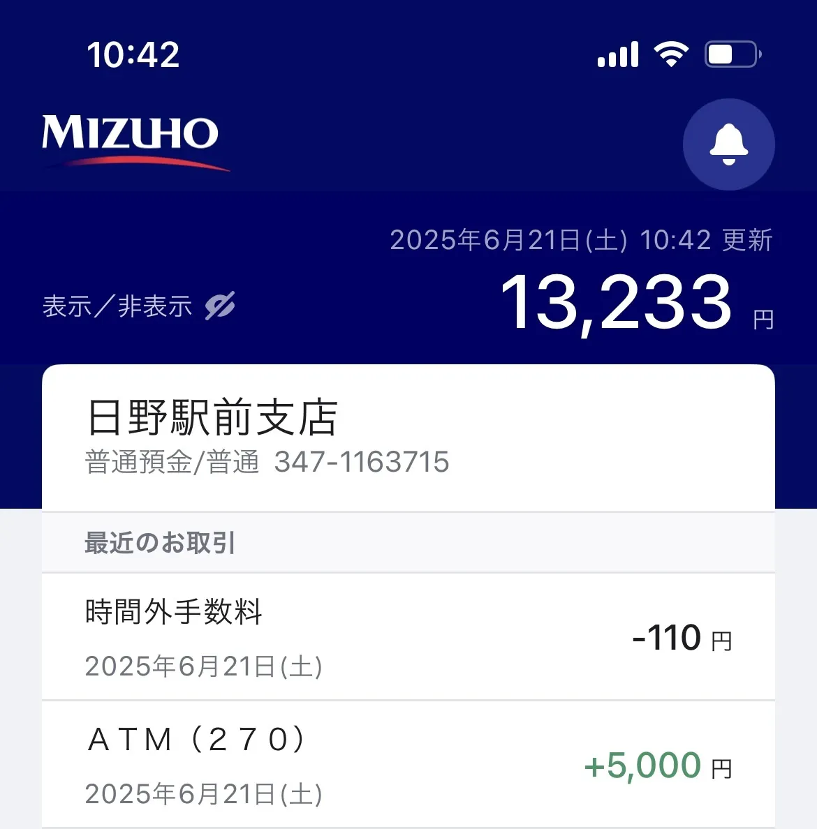 後の残りの金額を振り込み、残金13233円です。