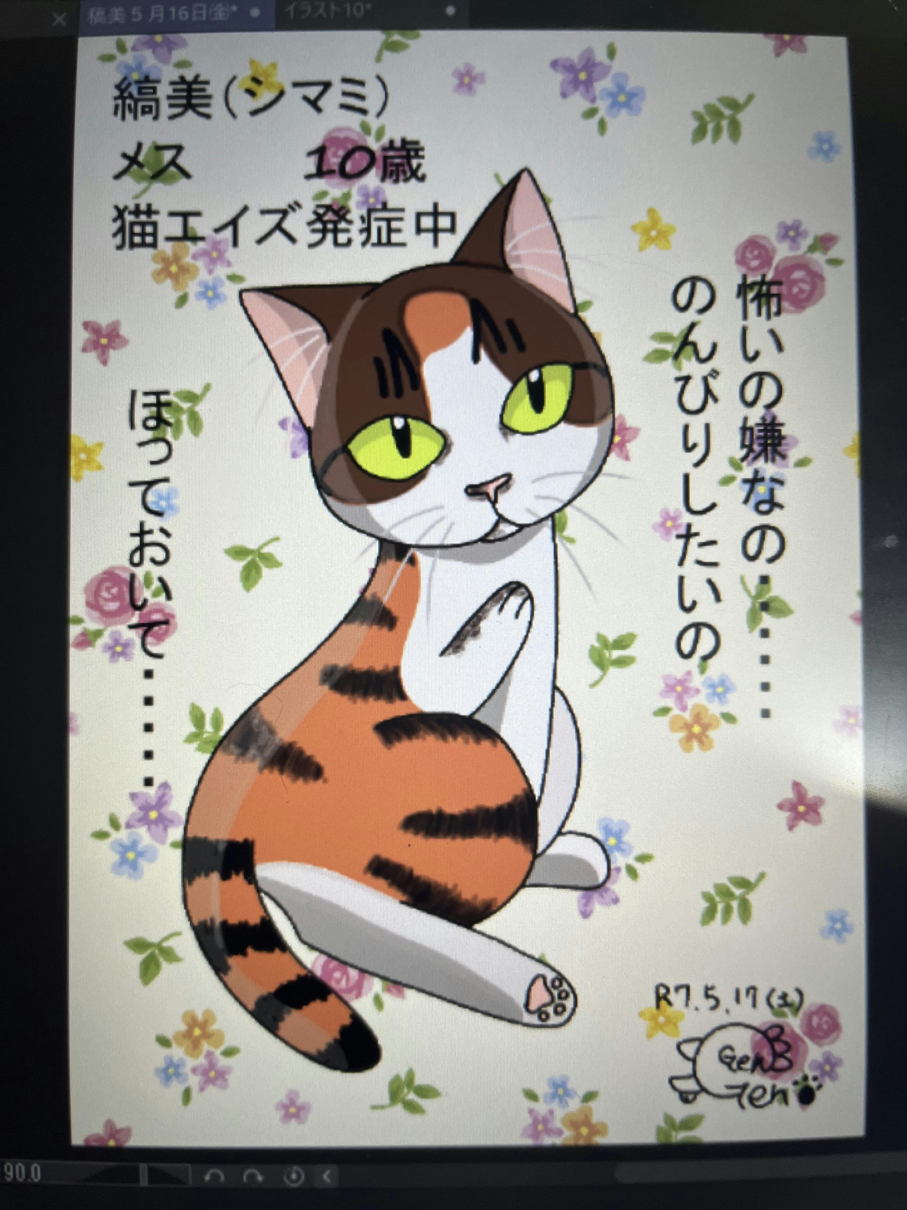 ご支援者様ご一同にお礼を申し上げますm(_ _)m病気部屋の猫達は、緩和ケアのおかげで、安定して食べています。また具合が悪くなったら、緩和ケアをしなければならないと思っております。私のリハビリの一環で、デジタルイラスト作成しております。今回は猫エイズのシマミちゃんが完成致しました。6兄弟姉妹の末っ子。発症してから数年、この子もどのくらいまで生きるか分かりませんが、精一杯お世話させて頂きますm(_ _)m