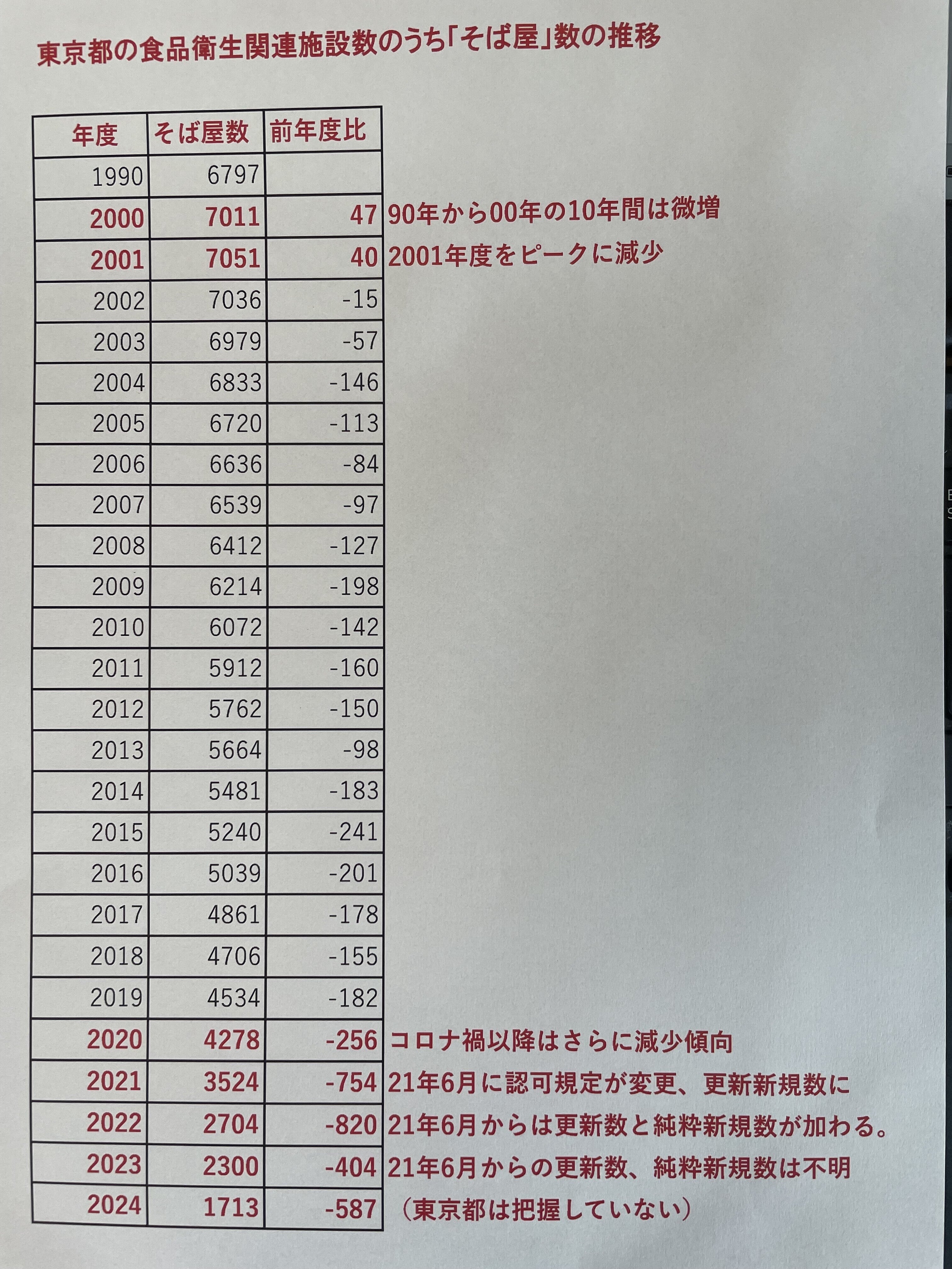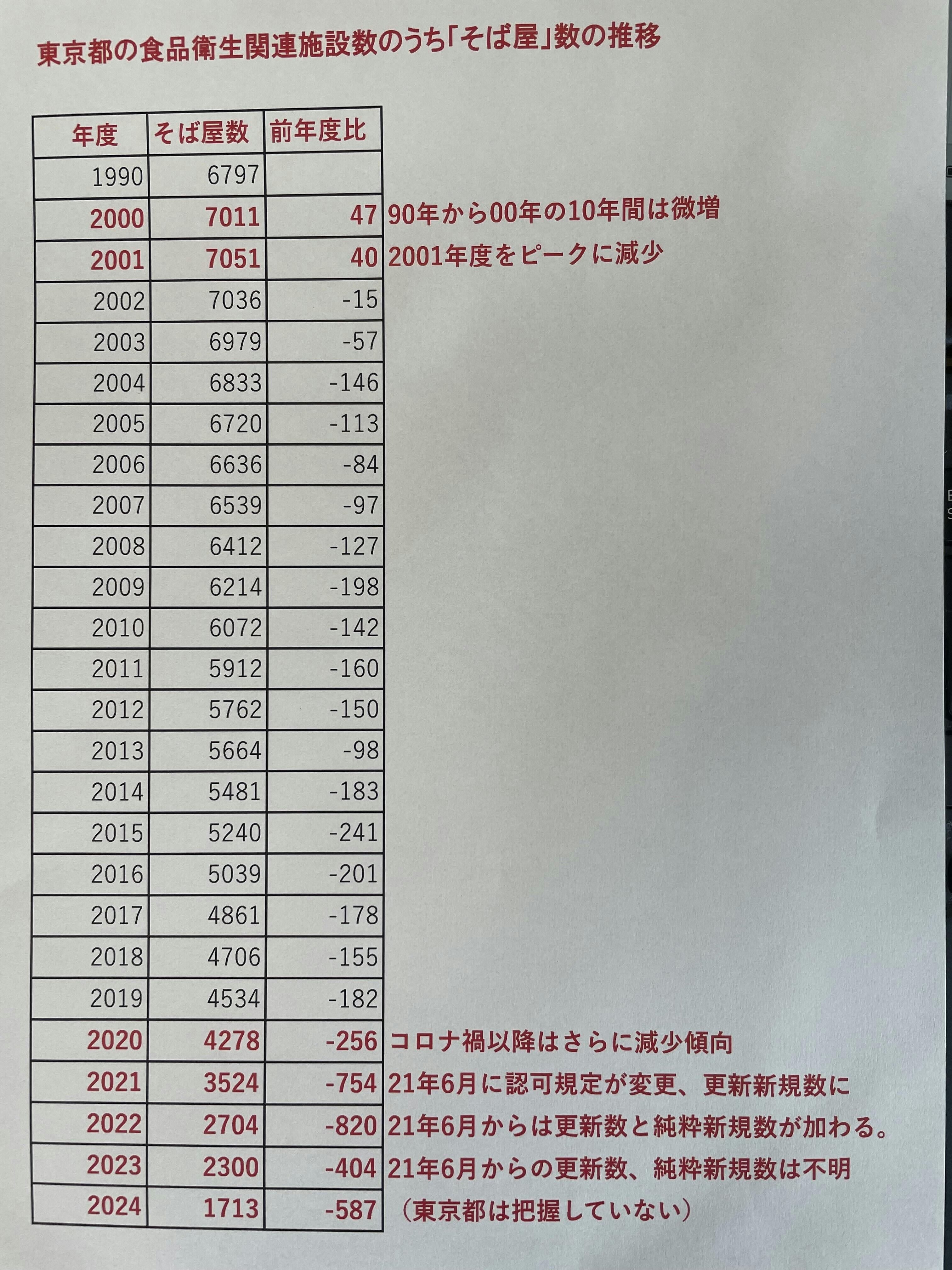 この表では2021年6月以降は認可更新数と新規認可数が加わっていない。実際の東京の蕎麦屋数は、この蕎麦屋数に更新数と新規認可数が加わることになるが、全体数は減り続けていると予想される。2021年6月以降、東京都は蕎麦屋数を公表していない。東京都が蕎麦屋を注視しなくなったと言えなくもない。