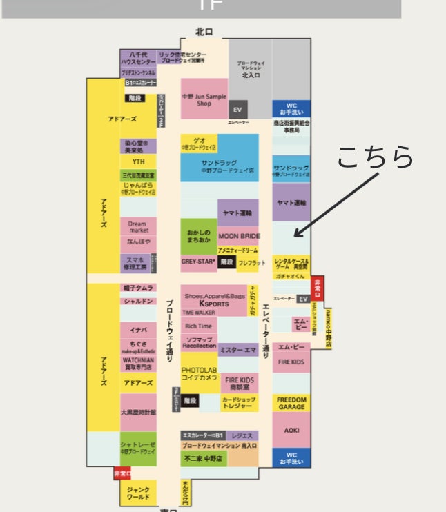1Fのエレベーター通り(中野生まれでもそんな名前がこの通りについてたのは知らない。。)、通称"1Fの右側の細い通り"の奥、ヤマト運輸さんとフィギュアショップさんに挟まれたところです!今はシャッターですが、Zombie Stormのポスターも貼ってあります!