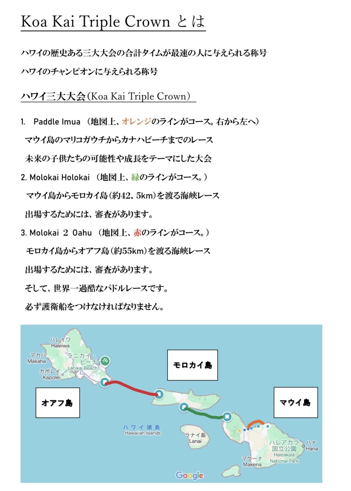 マウイ島内で競い合うレース(13km)・マウイ島からモロカイ島へのレース(42.5km)・モロカイ島からマウイ島へのレース(53km)で構成されます。