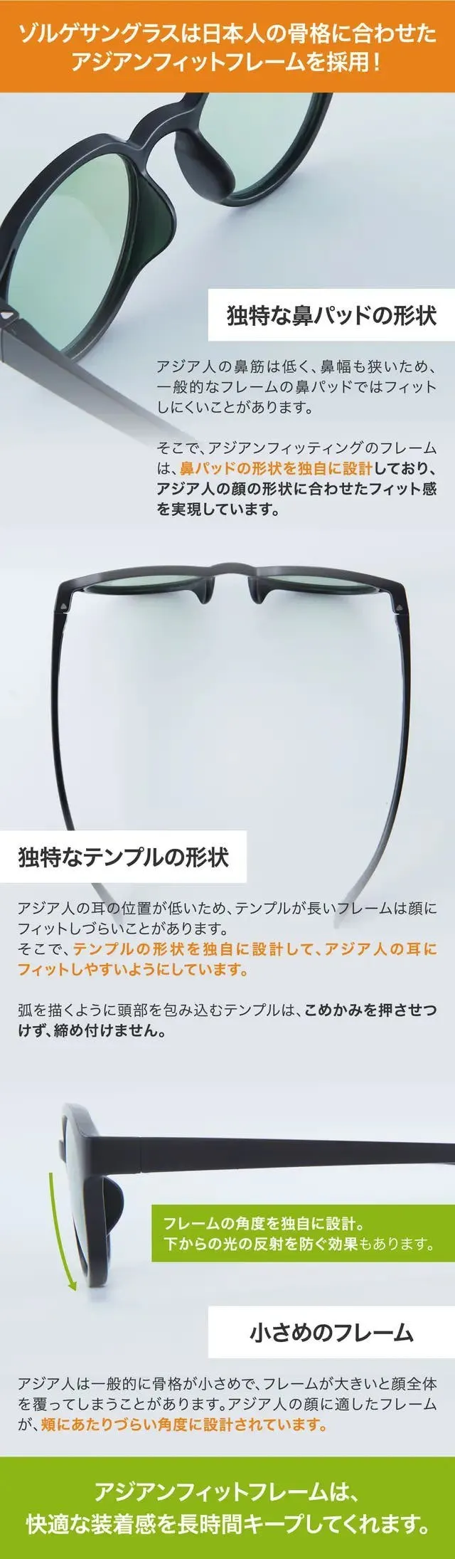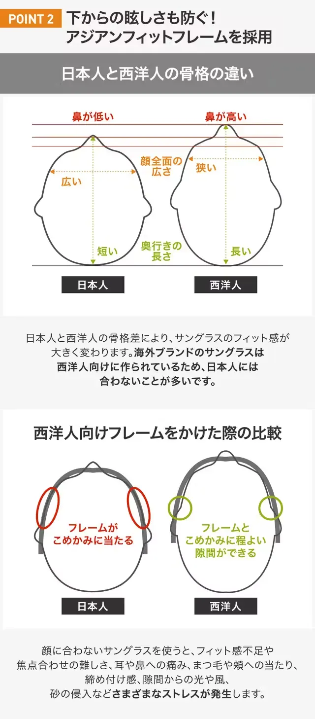A2.基本的には、ユニセックスです。アジア人の骨格にフィットするアジアンフィットフレームを採用しています。ラバー加工により小顔の方にもフィットしやすくなっています。