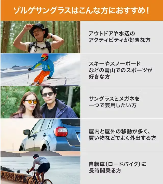ゾルゲサングラスは、「調光・偏光・UVカット」全てを1つのレンズで実現!