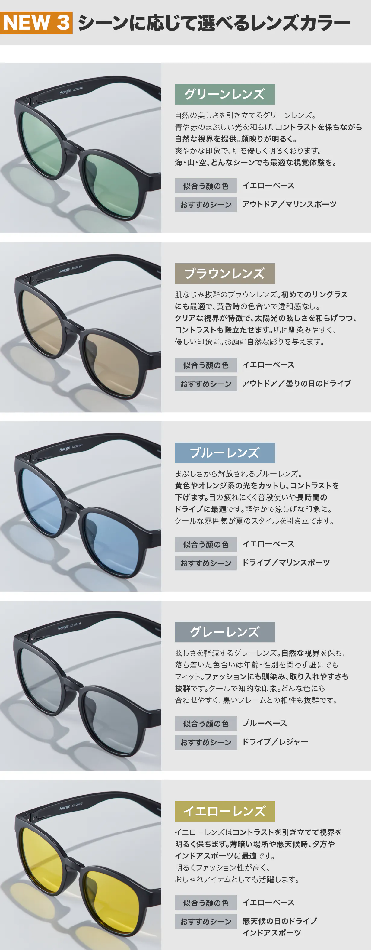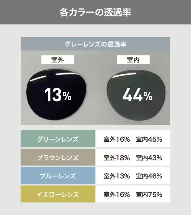 ・レンズカラー:クリアグレー/イエロー/グリーン/ブルー/ブラウン