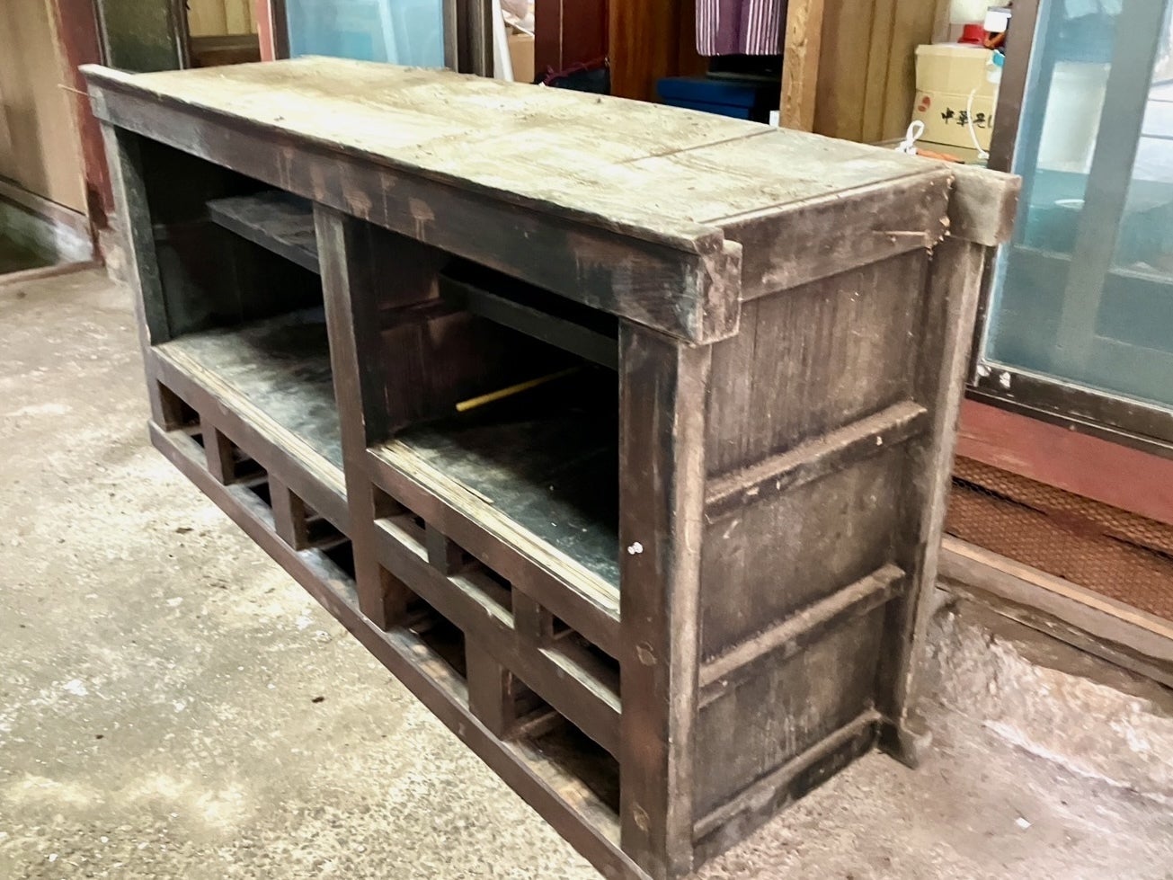 工房のいちばん奥に どっしりと鎮座していた、少なくとも100年以上前に作られたという大きな食器棚。