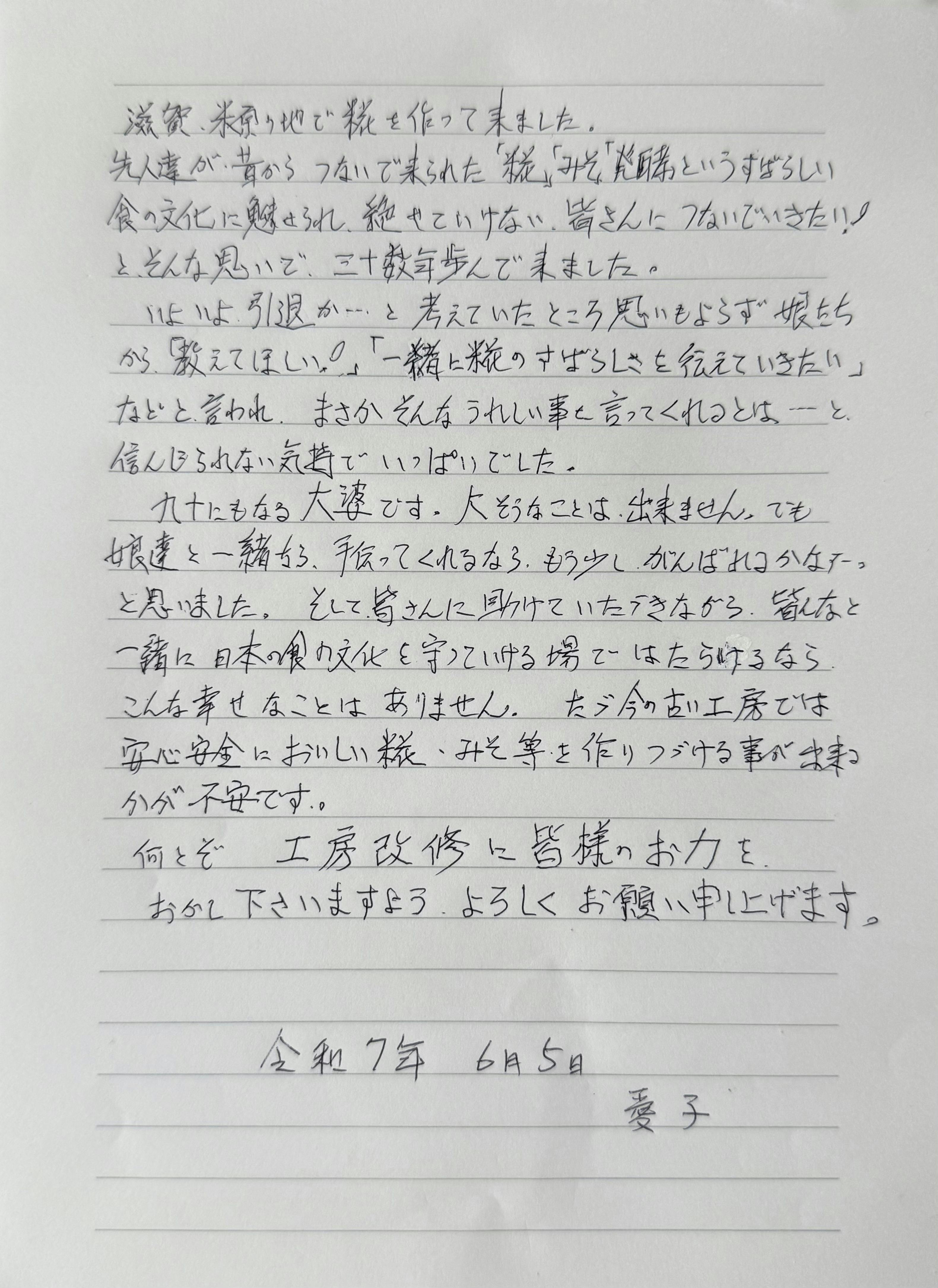 2025/08/31 07:0062日間の挑戦、いよいよクライマックスへ。みなさま、いつもあたたかい応援をありがとうございます!!8月29日、ネクストゴール350万円 を達成することができました!ここまで来られたのは、ひとえに支えてくださった皆さまのおかげです。本当に力をいただきました。感謝の気持ちで胸がいっぱいです。8月30日現在、258名様から 3,611,700円 のご支援をいただいています。スタートしたときには想像もしていなかった大きな数字。そして、その数字以上に、ひとつひとつのご支援に込められた想いの重みを強く感じ、身の引き締まる思いです。みなさま、本当にありがとうございます!!県庁の「北の近江振興プロジェクト」の皆さまが視察に来訪8月28日、県庁「北の近江振興プロジェクト」の皆さまが視察に来訪くださいました。三日月滋賀県知事がご多忙のため、今回は所長様が代わりに来られ、「まんまる日和のクラファン、すごい支援者さんの数ですね!たくさんの方からの応援は嬉しいですね!」と、温かいお言葉をいただきました。そして視察の場では、さまざまな話題で盛り上がりました。あいこおばあちゃんが「若い人や学びたい人に、このすばらしい日本の食文化を伝えていける場ができるのは楽しみです。梅干し作りやよもぎのあく抜きなんかも、工房で一緒にできたら楽しいですね。」と語ると、皆さま笑顔で「いいですね~!」とニコニコ耳を傾けてくださいました。また、主査の方からは「子どもの頃、祖父が作ったお米を一粒残さず食べたものです。今は“作る場面”が見えにくくなってしまったからこそ、子どもへの食育もむずかしい。あいこおばあちゃんのお話のような場は本当に大切ですね」と心強いお声もいただきました。まだ見ぬ“まんまるラボ”で、人が集いにぎやかに食を楽しむ光景を、私たちと一緒に思い描いてくださっているようでした。インターンで同行された実習生さんは「糀って初めて知りました!発酵食品のことも知って、今日来られて本当に良かったです」と、キラキラした目で感想を話してくれました。若い世代にとっても新しい学びになるのだと、改めて心強く感じました。「これから、どんな方々がどんな学びや経験をしに来られるのか、楽しみに見守らせてください!」と力強い応援もいただき、まんまる日和には頼もしい応援団がついているのだと心から感じました。積み重ねてきた日々が宝物に。工房再生プロジェクト最終日。そして、いよいよ今日は 最後の1日。本日 8月31日 23時59分をもって、まんまる日和の熱い62日間が幕を閉じます。ここまでの日々は、間違いなく、かけがえのない宝物になりました。でも、まだ終わりではなく、まだ1日あります。残り時間、私たちのプロジェクトを一人でも多くの方に伝えたいと思っています。最後の最後の瞬間まで全力で走り抜きます。どうか、みなさまもこの瞬間を一緒に見届けていただけたら嬉しいです。心からの感謝を込めて。 もっと見る