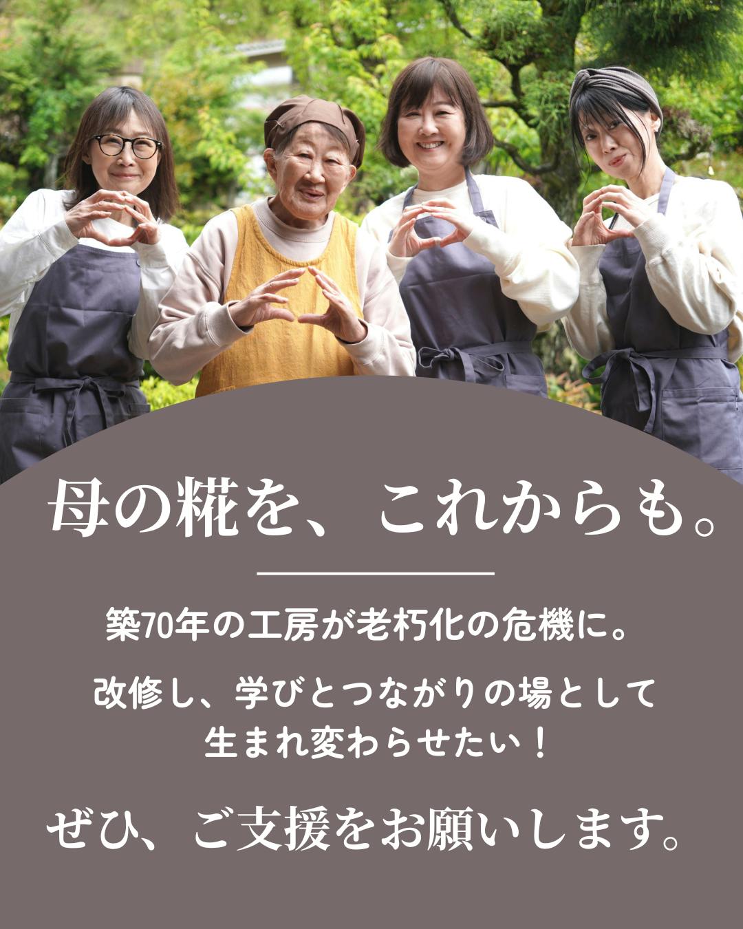 2025/11/13 17:57まんまる日和 工房改修完了のご報告このたび、長い準備期間を経て「まんまる日和 工房」の改修工事がほぼ完了し、プレオープンの日を無事に迎えることができました。当日は、私たちにとってかけがえのないご縁をいただいた方々がお祝いに駆けつけてくださいました。昨年4月、「母の味と想いを未来へつなごう」という思いから、三姉妹で始めた“まんまる日和”。当初は、ただ母の味を守りたい一心でした。小さな味噌づくりの延長のつもりが、次第に活動が広がり、工房の改修、そしてクラウドファンディングへの挑戦へとつながっていきました。古く傷みの激しい工房で作業をしていると、不安だらけで、たくさんの葛藤がありながらも改修を決意。それは母にとっても、長年大切にしてきた思い出の品々と向き合い、手放すことでもあり、母は本当によく決意してくれたなあと、改めて感謝しています。クラウドファンディングを通しては、全国からたくさんのあたたかいご支援と励ましの言葉をいただきました。ご支援者さまのお名前を何度も拝見しては胸が熱くなりました。また、昔の教え子さんや友人の方々から久しぶりに「応援してるよ」と声をかけていただくなど、時間を超えて多くのご縁が再びつながる喜びも感じました。工房の改修に携わってくださった職人さんや業者の皆さまも、私たちの想いを丁寧に汲み取りながら、心を込めて素晴らしい空間をつくりあげてくださいました。皆さまのおかげで、作業の場である「まんまる工房」は、安全面と動線に配慮し、使いやすく快適な空間へと整いました。また、交流の場となる「まんまるラボ」は、古い木の香りを残しながら、赤いベンガラが映える温かみのある空間に生まれ変わりました。「まんまる日和」らしい、どこか懐かしく心落ち着く場所となり、私たちの想像を超える仕上がりに心からの安堵と感謝の気持ちでいっぱいです。約8か月にわたる長い道のりを経て、この日を迎えられたことを心からうれしく思います。ここから、新たな「まんまる日和」が始まります。新くなった工房では、これまで以上に丁寧に、安定した環境で糀づくりができるようになりました。体制も整い、オンラインショップでのご注文受付も再開しております。また、【まんまるラボ】では、ワークショップや交流の機会も順次開催してまいります。これからも、より多くの方とのご縁が広がっていくことを願い、一つひとつに心を込めて丁寧にお届けしてまいります。糀やお味噌を通して日本の食文化を未来へつなぎ、これまでいただいたすべてのご縁を大切に、これからも“まんまるな気持ち”で歩んでまいります。これまでの温かいご支援とご声援に、心より感謝申し上げます。どうぞ、実家に遊びに行くような気持ちで、ぜひお気軽にお立ち寄りくださいね。リターンについてのご報告ご報告が遅れましたが、現時点でのリターンの履行状況についてご報告させていただきます。【お名前プレートについて】ご支援者の皆さまそれぞれのお名前プレートを作成し、完成した「まんまるラボ」に大切に飾らせていただきました。飾り付けの様子を写真撮影し、近日中にメールにてお送りいたします。お越しいただく機会がありましたら、ぜひ実際にご覧いただければ幸いです。..........................【リターン品の発送について】・まんまるロゴ入りミニエコバッグ・まんまるロゴ入りTシャツ・まんまる糀500g+レシピ10選・あいこおばあちゃんの手紙+レシピ10選・・何度でも使える15%割引クーポン上記リターン品については、10月より順次発送、現在全て完了しており、すでにご支援者皆様のお手元に届いているかと思います。・2倍糀の白みそ+エコバッグ・好評につき追加!2倍糀の白みそ+エコバッグについては、ただいま準備中です。仕込んだ白みそがおいしくできあがってきましたので、来週から12月にかけて順に発送予定です。今しばらく楽しみにお待ちくださいませ。・セレクトボックス・セレクトボックス②については、12月以降全て商品がそろい次第発送予定です。もうしばらくお待ちいただきますようよろしくお願いいたします。.........................【リターンの体験ワークショップについて】・味噌つくり体験・よもぎもち作り体験・糀作り体験・工房見学+新商品試食上記の体験ワークショップについては、皆様のご協力のおかげで日程調整が完了し、来週からいよいよ始まります。リニューアルしたまんまる工房&ラボで準備を整え、皆様のお越しを楽しみにお待ちしております。どうぞよろしくお願いいたします。 もっと見る