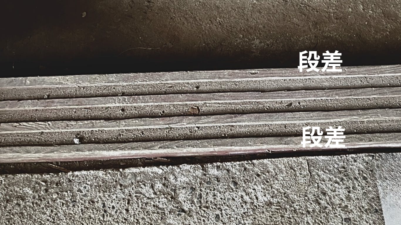 今にも抜けそうで踏むと危険なので、下に添え木がある場所に白いテープを貼り、その上を踏むようにしています。