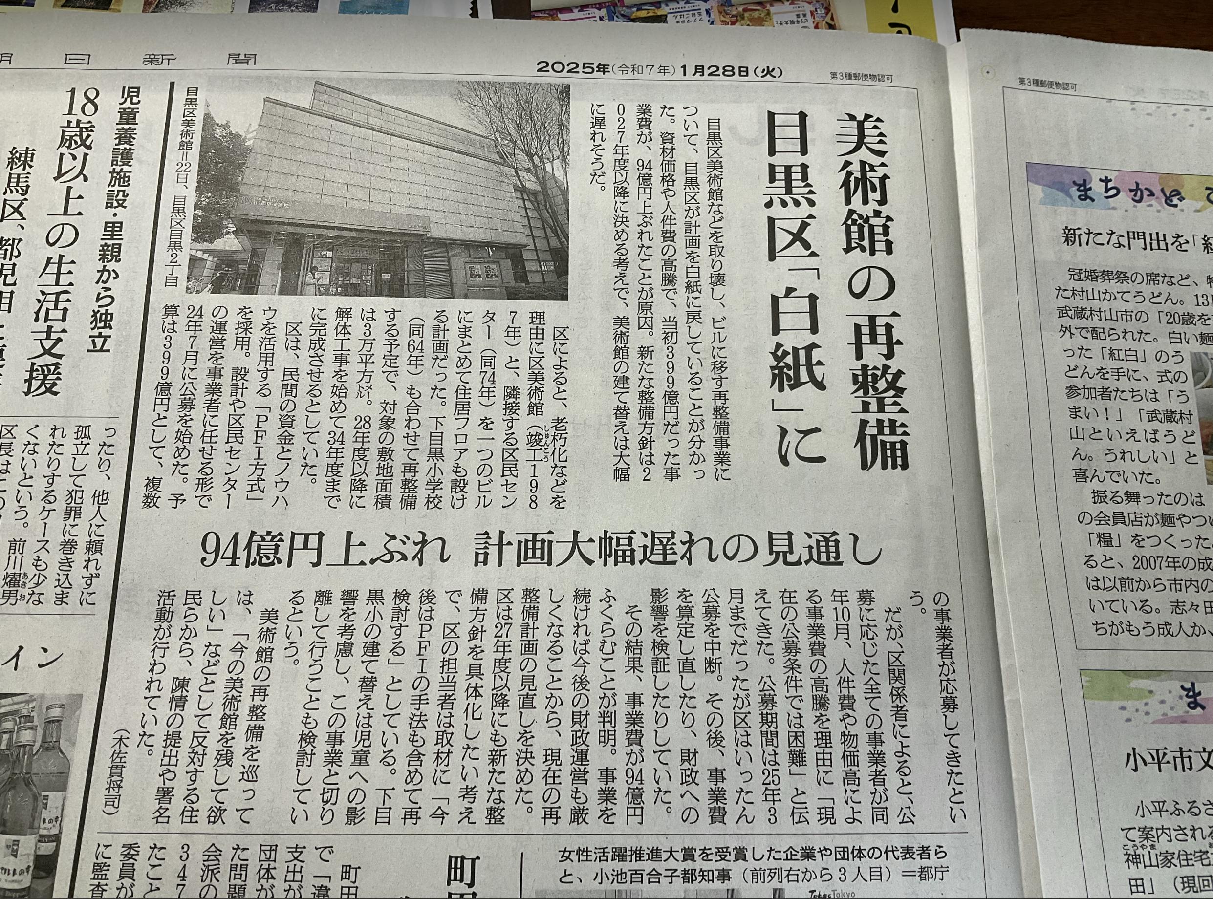 朝日新聞記事より 目黒区美術館の解体計画などの一旦延期についての報道