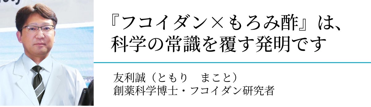 そしてついに、フコイダンに「もろみ酢濃縮粉末」を配合することで、フコイダンの使用量を既存のフコイダンサプリの半分にしてコストを抑えながら、働きを3倍(=同量のフコイダンなら働きは6倍)にする製造技術を発明しました。」