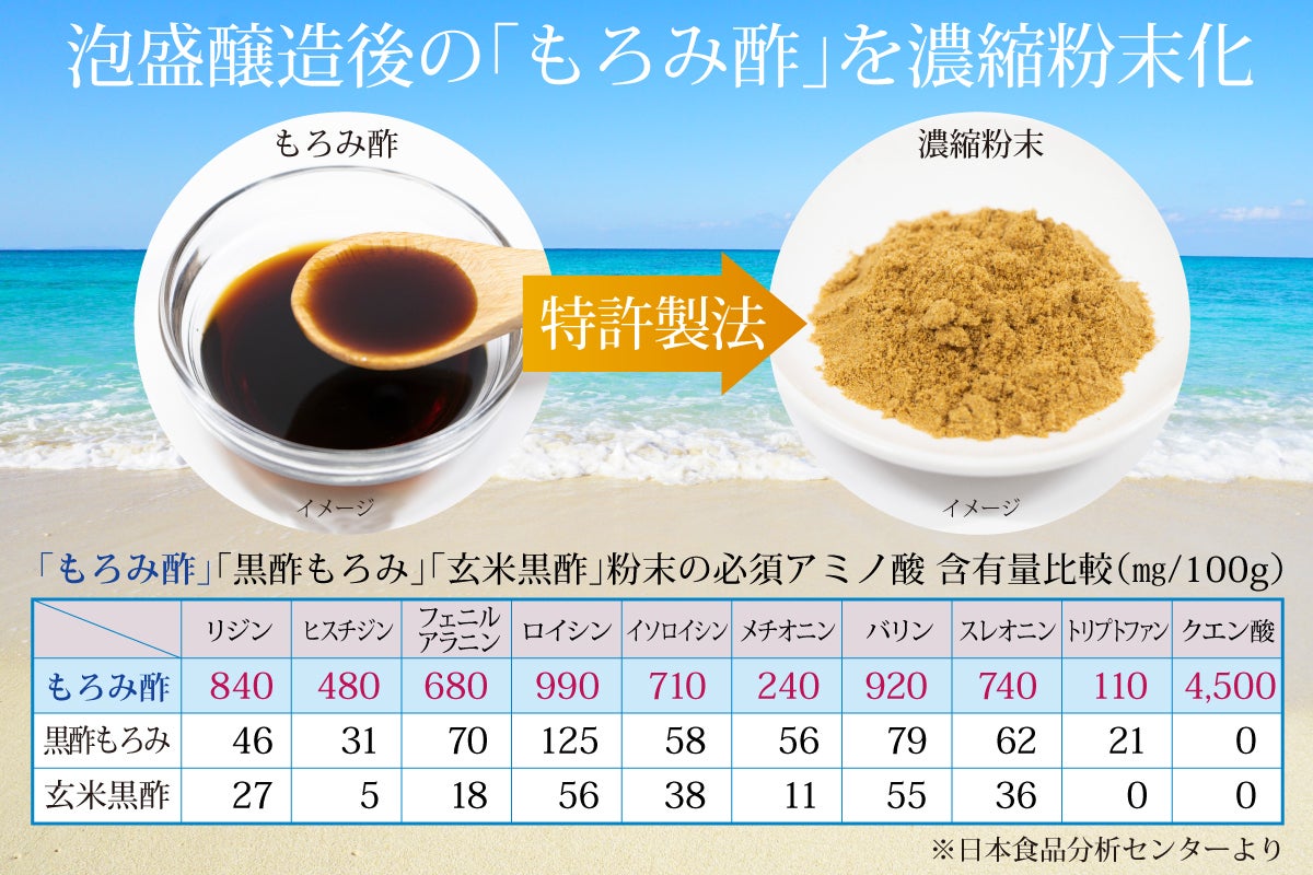 もろみ酢濃縮粉末の原料は、泡盛の製造工程で発生する泡盛粕です。泡盛粕は、泡盛の原料米を発酵させる黒麹菌が生み出すアミノ酸・クエン酸の含有量が、黒酢などと比べても桁違い。それなのに使われていない余剰の泡盛粕が、フコイダンの働きを向上させるという事実は、沖縄の泡盛業界にも喜びをもって迎えられました。