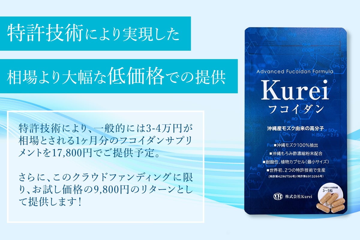 「Kurei フコイダン」は、特許技術により既存のフコイダンと比べて効果アップ&コストダウンを同時に実現した画期的なサプリメントです。業界では、科学の常識を覆したとまで言われています。私たちは、ようやく到達したこの発明で、すでにフコイダンサプリをご利用の方の経済的な負担を軽減するとともに、フコイダンを必要としているすべての方々の健やかな生活を後押ししたいと願っています。ですが、沖縄は日本の都道府県で唯一、陸路で他県と繋がっていない小さな島です。 そのため、生産・販売にさまざまなハードルがあります。このハードルを乗り越えるため、皆様のお力をお貸しください。