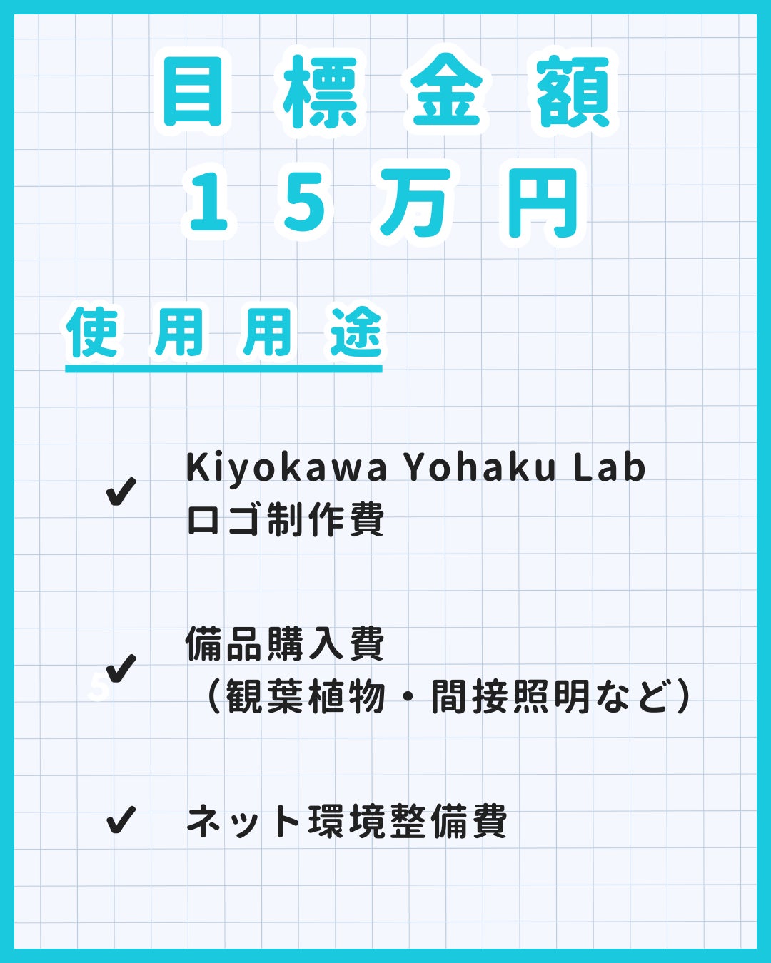 今回のプロジェクトは、目標金額を15万円とさせていただきました。しかし本来の目的は、1人でも多くの人に"Kiyokawa Yohaku Lab"を知っていただき、「何から始めたらいいかわからない人」を応援する拠点として認知していただきたいという想いが強いです。そのため、さまざまな人が利用できるような環境を整備したいと考えております。