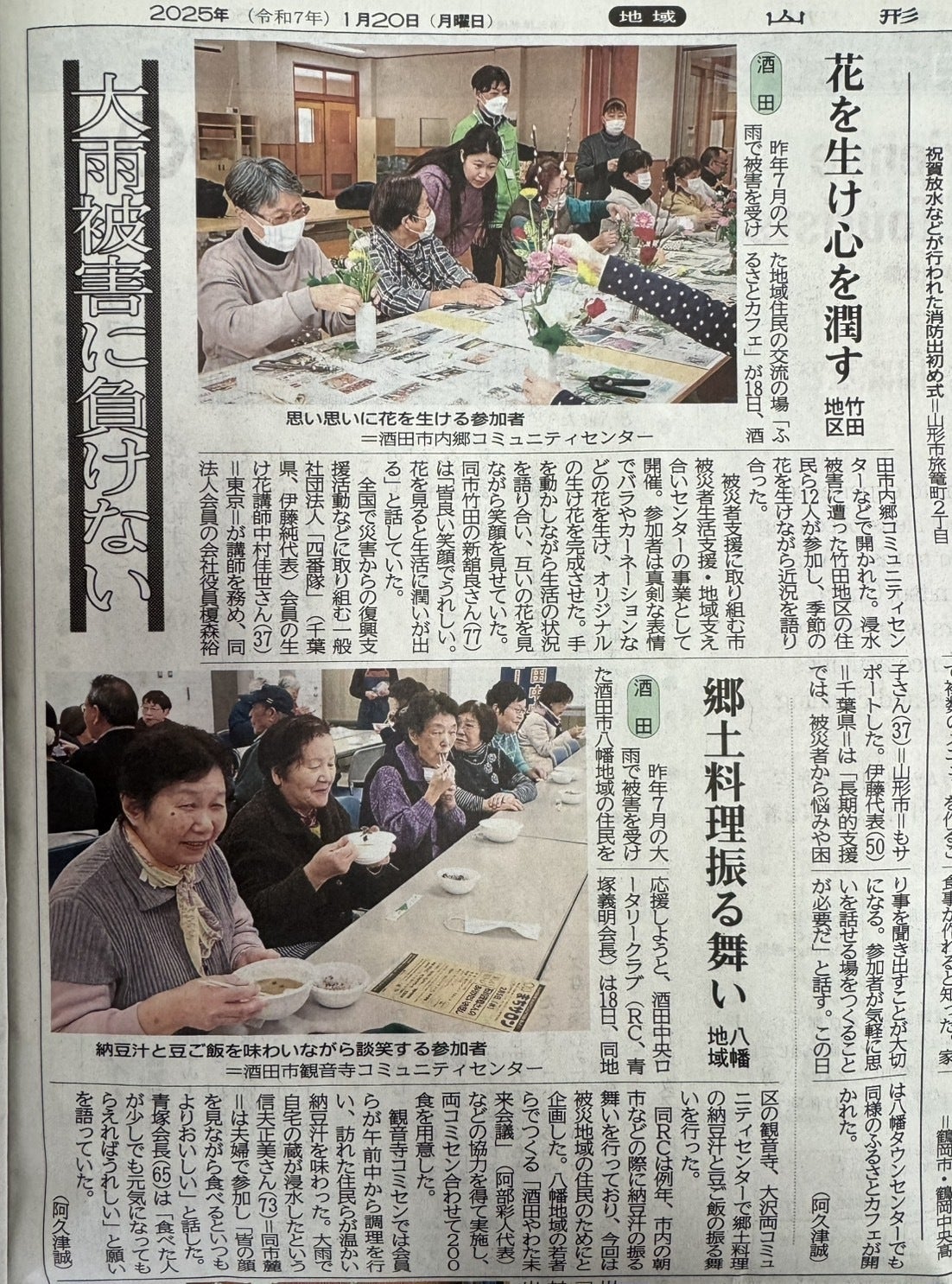 昨年7月の豪雨災害で甚大な被害を受けた山形県酒田市にて、被災された方々へのサロン活動を継続して実施しております。発災直後は酒田市災害ボランティアセンターにて酒田市社会福祉協議会さまにご協力いただき、災害直後の豪雨被害支援活動を実施。被災ニーズの完了とともに、酒田市災害ボランティアセンターは「酒田市被災者生活支援・地域支え合いセンター」に名称が変更、被災者さまの心と体のケアを目的とした場づくりに取り組むお手伝いをさせていただいております。