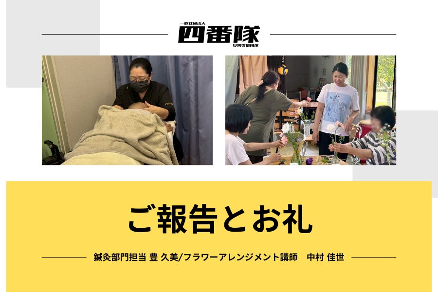 2025/09/28 12:37本日、いよいよクラウドファンディング最終日を迎えました。たくさんのご縁と想いに支えられ、無事に目標を達成することができ、心より感謝申し上げます。この歩みを共にしてくれた皆さまへ、現地で活動を続けてきた鍼灸師とフラワーアレンジメント講師からの言葉をお届けします。【ご報告とお礼】クラウドファンディング目標達成のご支援、誠にありがとうございます!この度、四番隊として初めて挑戦したクラウドファンディングが、皆様の温かいご支援のおかげで目標達成!となりました。ソフト面部門の一員として、心より感謝申し上げます。プロジェクトの立ち上げから今日まで、多くの方々から期待のお声や応援メッセージをいただき、その一つ一つが大きな励みとなりました。私たちは、石川県七尾市、山形県酒田市の被災地で、「鍼灸による心と身体のケア」に重点を置いて活動を続けてまいりました。被災された方々のお身体の痛みだけでなく、先の見えない不安や、慣れない避難生活からくる「心の張り」や「緊張」がどれほど大きいか、現地で接するたびに痛感しています。当初は「鍼灸で心のケアなんてできるのだろうか」という不安もありましたが、「久しぶりに気持ちよく眠れた」「体が温まり、少し楽になった」「話を聴いてもらえて、気持ちが軽くなった」と仰ってくださる方々の笑顔に、この活動の意義を強く感じています。今回のクラウドファンディングの達成は、私たちの活動への期待と、被災地の「心のケア」の必要性を皆様がご理解くださった証だと受け止めています。託していただいた支援金は、現地での活動を継続し、被災された方々の心と体に寄り添う「温かい時間」と「安心」を届けるために使わせていただきたいと思います。そして、皆様のご期待に応えられるよう、一同、より一層尽力してまいります。改めまして、ご支援くださった全ての皆様に深く御礼申し上げます。今後とも、四番隊をよろしくお願いいたします!皆様の健康とご多幸を祈念しつつ…鍼灸部門担当 豊 久美このたびは、私たちのプロジェクトに温かいご支援を賜り、誠にありがとうございます。おかげさまで、目標金額を達成することができ、花の支援活動をこれからも継続していける見通しが立ちました。私自身、初めてのボランティアとして、「花で何かできないか」という想いからこの活動を始めました。右も左もわからない中でのスタートでしたが、支えてくださった皆さまのおかげで、1年以上続けることができています。活動を通して、参加者の方々から「花っていいわね」「癒されるわ」「嫌な気持ちもこの時は忘れられる」といった言葉をいただくことがあり、心から嬉しく、続けてきて本当に良かったと感じています。さらに、花をきっかけに参加者同士の交流も生まれ、笑顔が広がる場面にもたくさん立ち会うことができました。花はただ美しいだけでなく、人の心に寄り添い、そっと力をくれる存在です。被災地の方々、そして支えてくださる皆さまへ、そんな“やさしい時間”をお届けできるよう、これからも丁寧に活動を続けてまいります。今後も活動の様子をお伝えしていきますので、あたたかく見守っていただけましたら幸いです。改めまして、心より感謝申し上げます。フラワーアレンジメント講師 中村 佳世 もっと見る