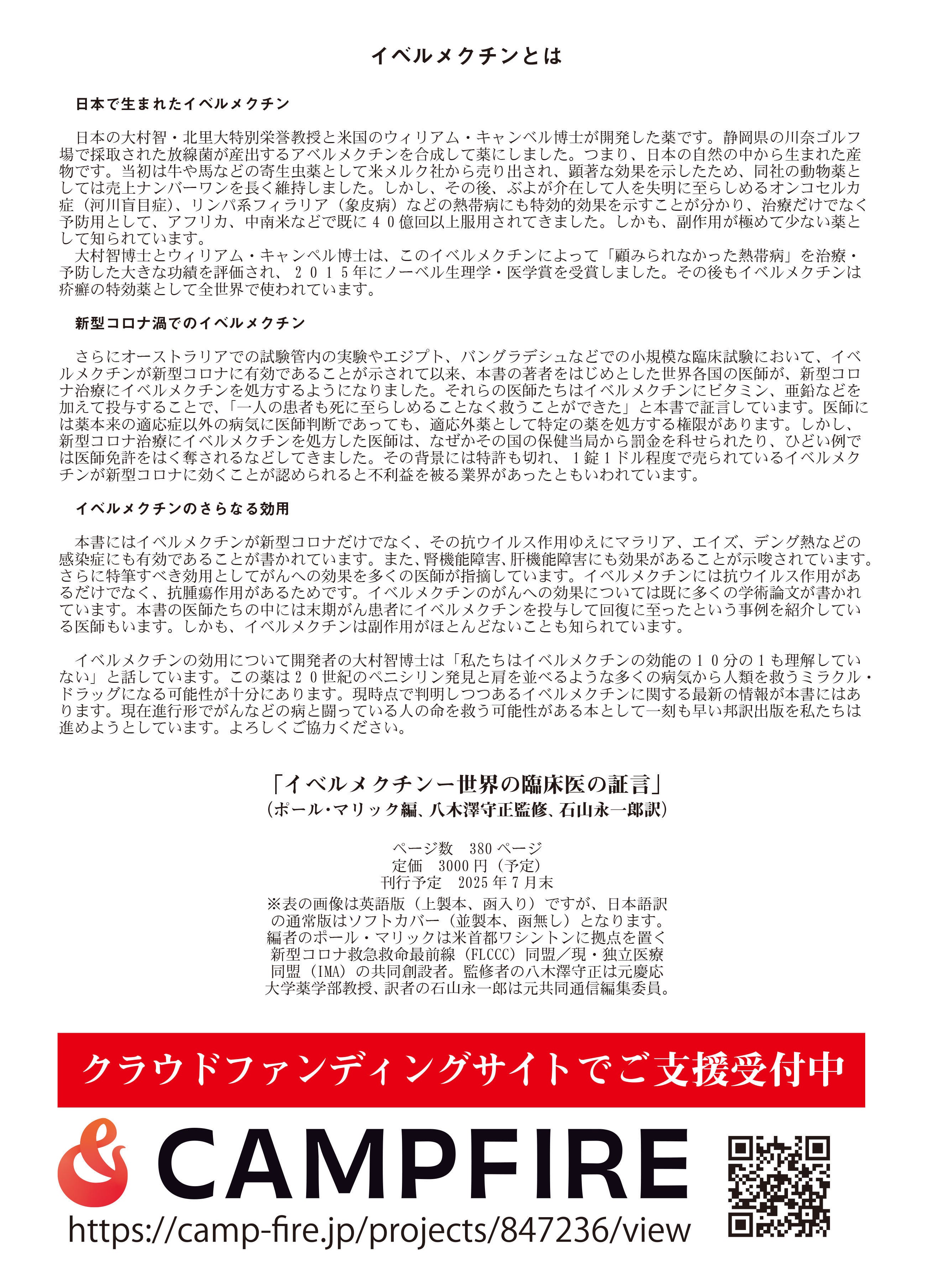「イベルメクチン」をめぐる様々な問題に一石を投じるために、皆様のネットワークでより多くの方々にこのプロジェクトの存在を広めて頂けたましたら幸いです。