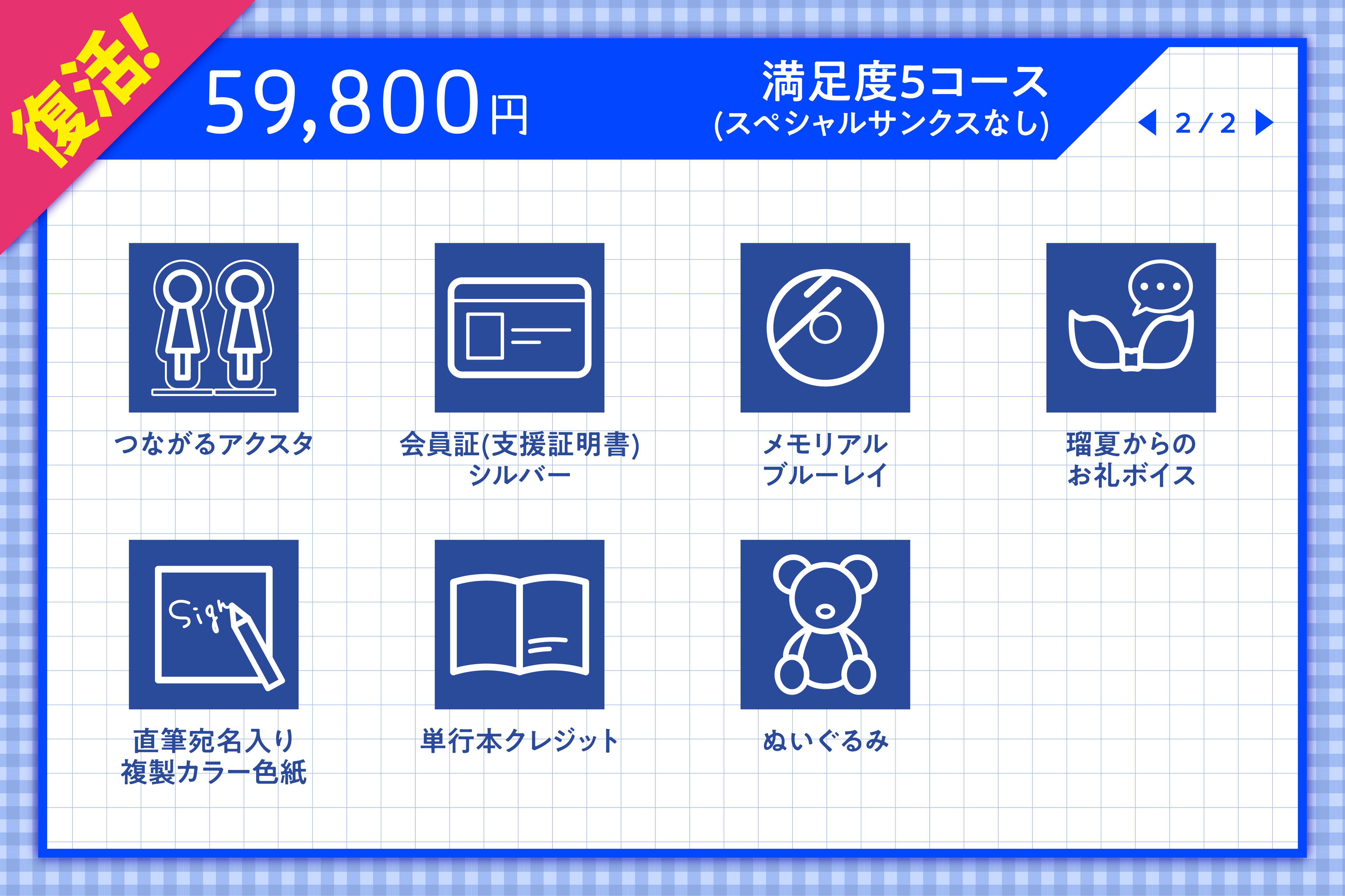 なお、復活した満足度5コースですが、掲載枠の関係上、今回の募集ではスペシャルサンクスの掲載は無しでのご案内となりますことを予めご了承ください。