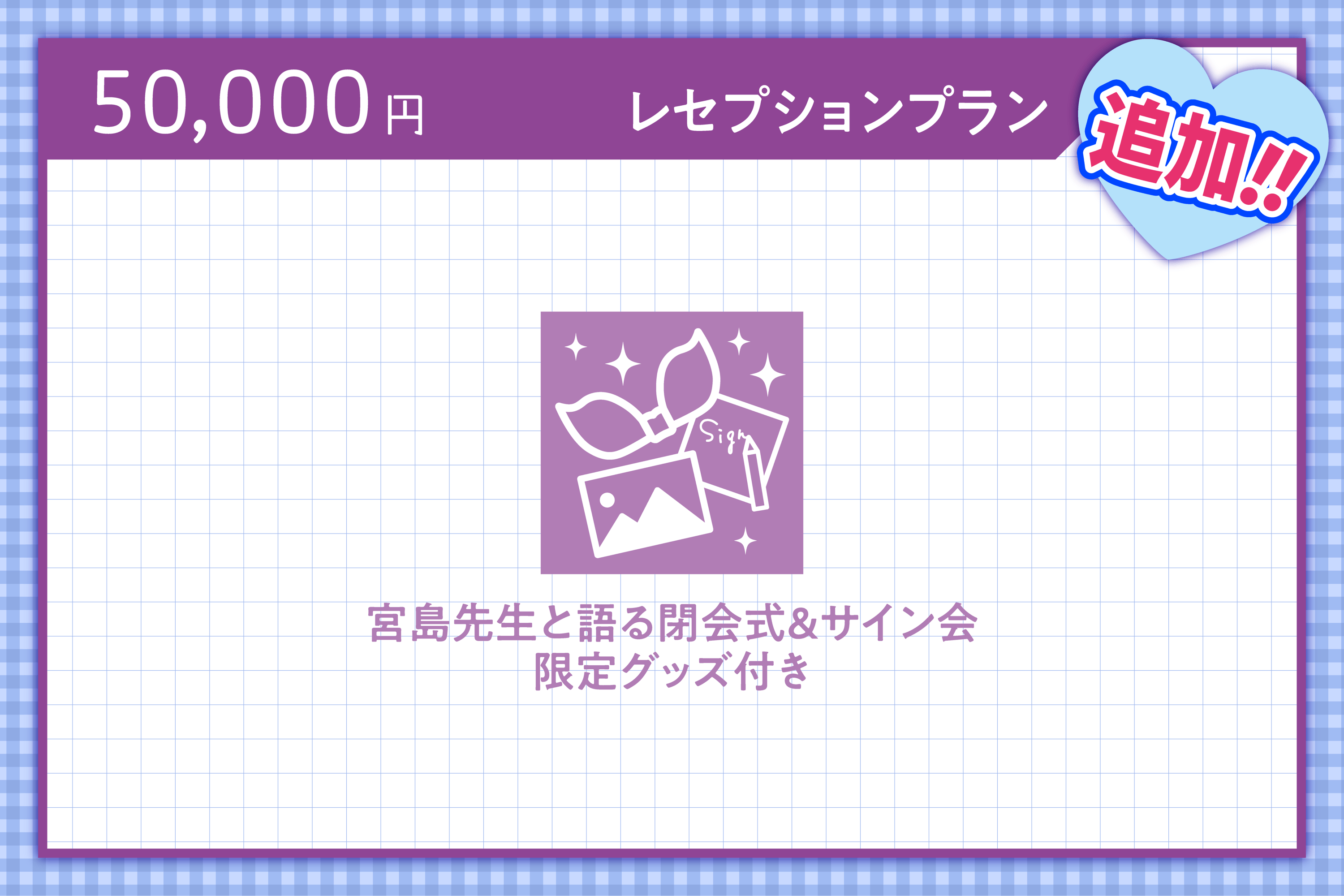 \レセプションプラン復活!/続いて、復活が決定したレセプションプランをご紹介いたします!こちらも開始15分で完売と大人気だったレセプションプランですが、今回は閉会式として復活します!レセプションプラン宮島先生と語る閉会式&サイン会 限定グッズ付き・日時:2025年8月31日(日) 18:00~20:00 ・場所:原宿近辺(個展会場)宮島先生との個展の閉会式&サイン会にご参加いただけるスペシャルなプランとなっております!限定数は"20"となりますので、【7月24日(木)18:00〜】の支援開始をお見逃しなく!